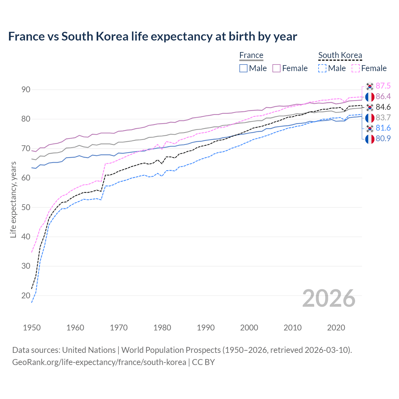 The average life expectancy at birth is 83.7 years in France vs 84.6 in South Korea. France is ranked 15/197 by life expectancy, and South Korea is 4/197. In France, the life expectancy is 80.9 years for males and 86.4 years for females. In South Korea, it's 81.6 years for males and 87.5 years for females.