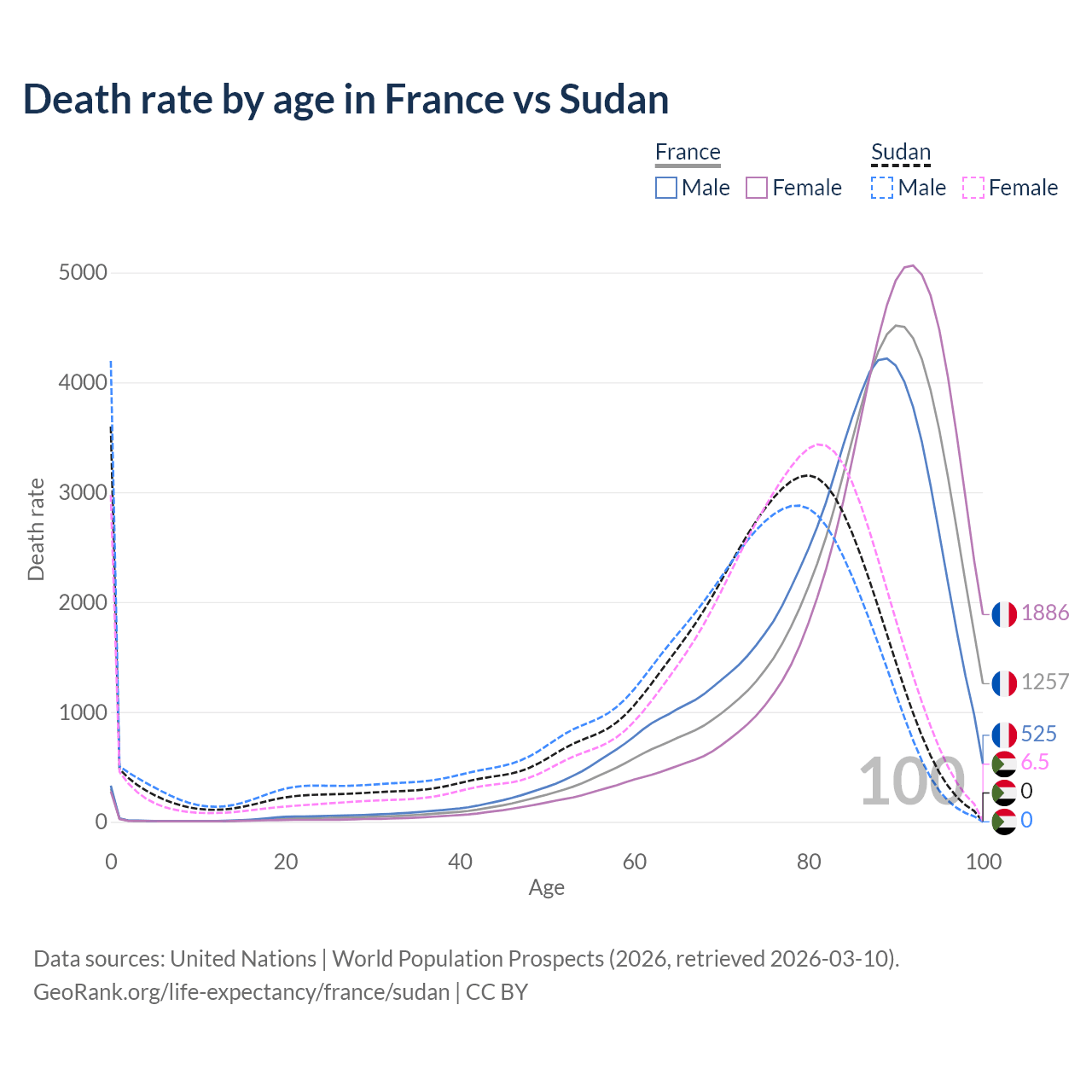 In France, the most common age of death is 90, compared to 0 in Sudan. The median age of death is 87.4 in France and 74.1 in Sudan, meaning only half of each cohort is expected to live past that age.