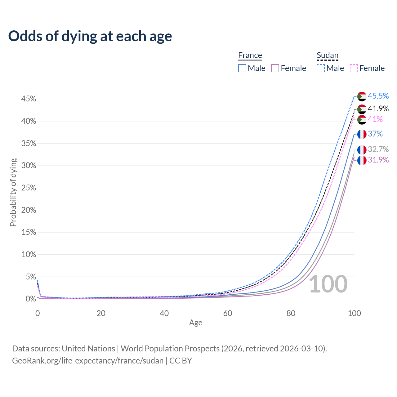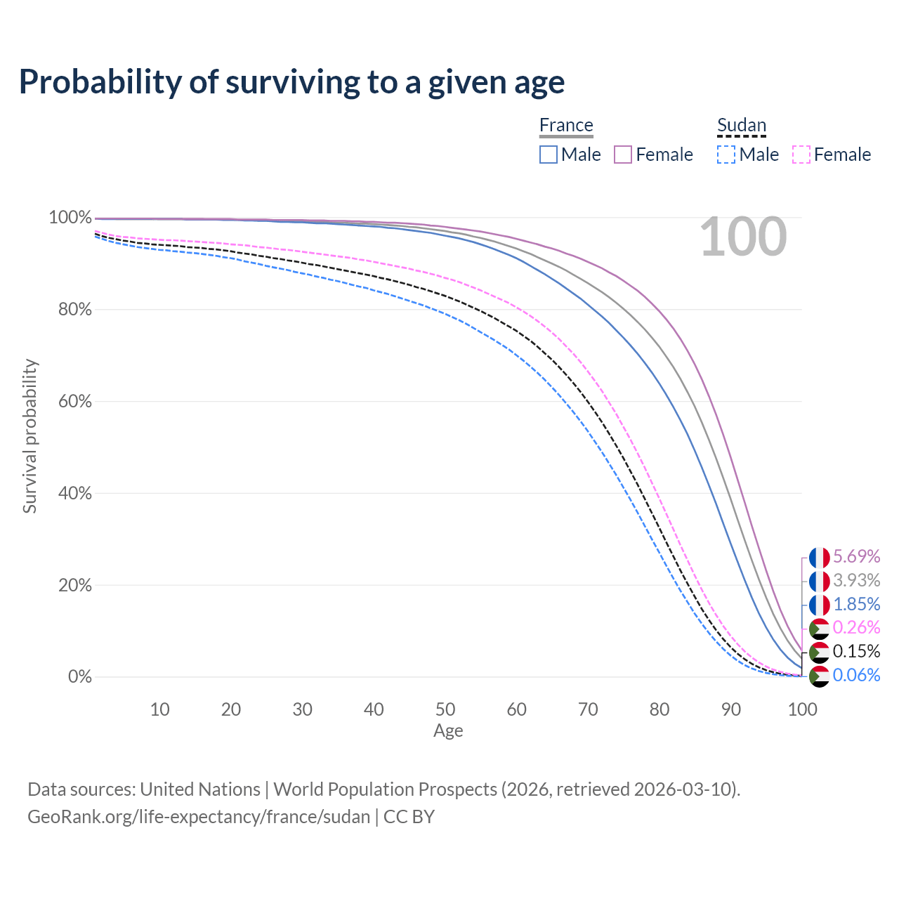 This life expectancy calculator shows the odds of living to 100, 95, 90, and below based on current age for both males and females in France and Sudan, along with mean and median age of death. The calculations are based on the 2026 life tables (actuarial tables) from the UN World Population Prospects.