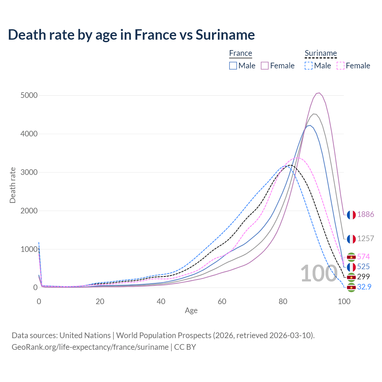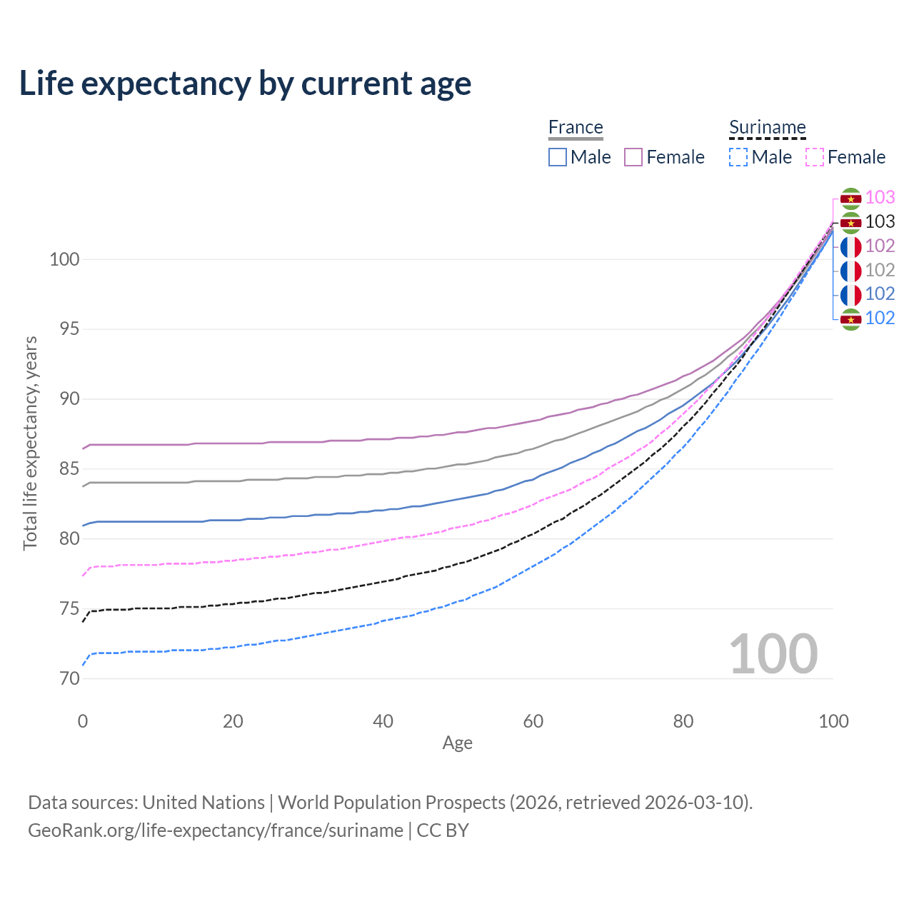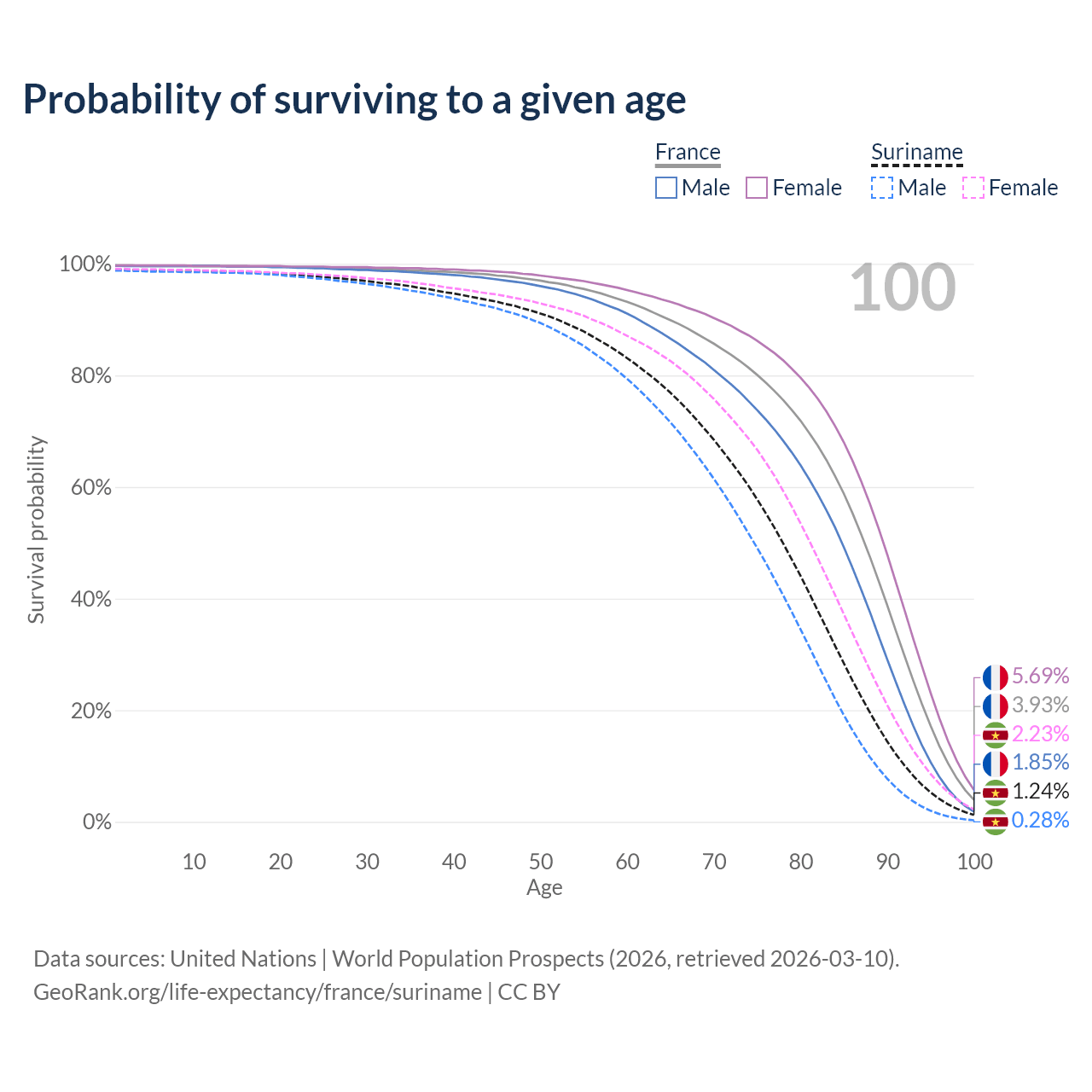 This life expectancy calculator shows the odds of living to 100, 95, 90, and below based on current age for both males and females in France and Suriname, along with mean and median age of death. The calculations are based on the 2026 life tables (actuarial tables) from the UN World Population Prospects.