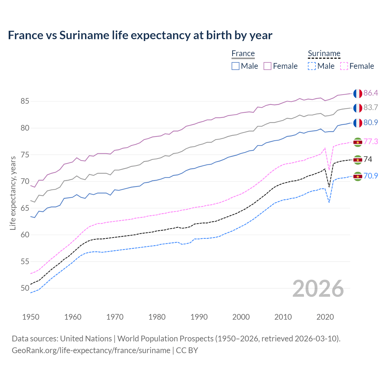 The average life expectancy at birth is 83.7 years in France vs 74 in Suriname. France is ranked 15/197 by life expectancy, and Suriname is 103/197. In France, the life expectancy is 80.9 years for males and 86.4 years for females. In Suriname, it's 70.9 years for males and 77.3 years for females.
