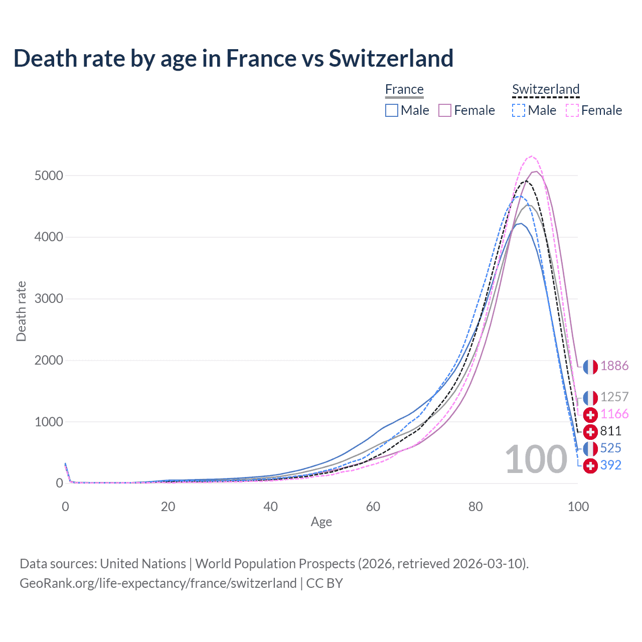In France, the most common age of death is 90, compared to 90 in Switzerland. The median age of death is 87.4 in France and 87.2 in Switzerland, meaning only half of each cohort is expected to live past that age.