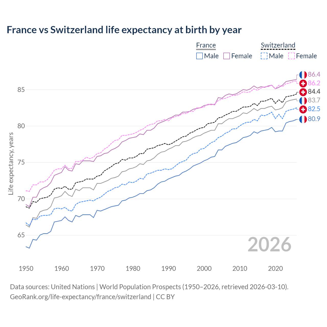 The average life expectancy at birth is 83.7 years in France vs 84.4 in Switzerland. France is ranked 15/197 by life expectancy, and Switzerland is 6/197. In France, the life expectancy is 80.9 years for males and 86.4 years for females. In Switzerland, it's 82.5 years for males and 86.2 years for females.