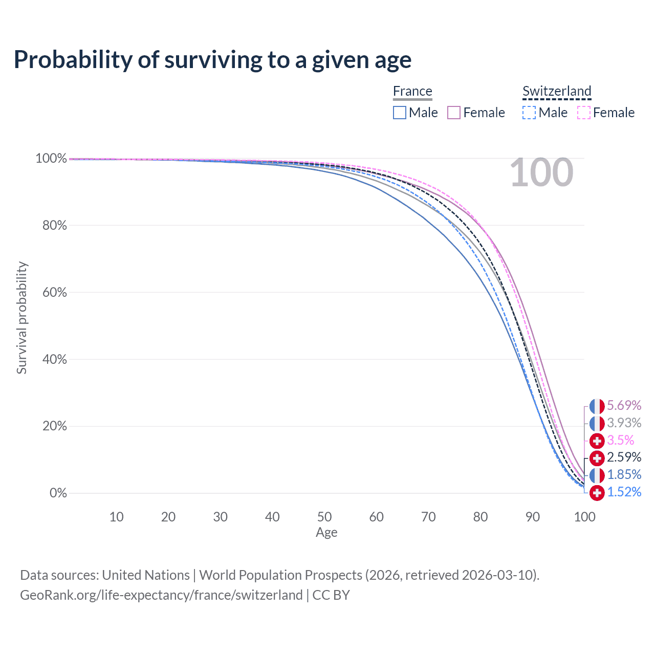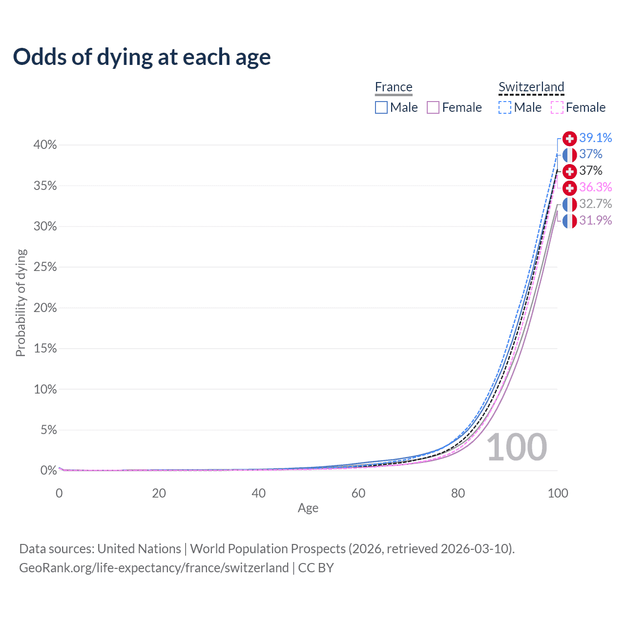 This life expectancy calculator shows the odds of living to 100, 95, 90, and below based on current age for both males and females in France and Switzerland, along with mean and median age of death. The calculations are based on the 2026 life tables (actuarial tables) from the UN World Population Prospects.