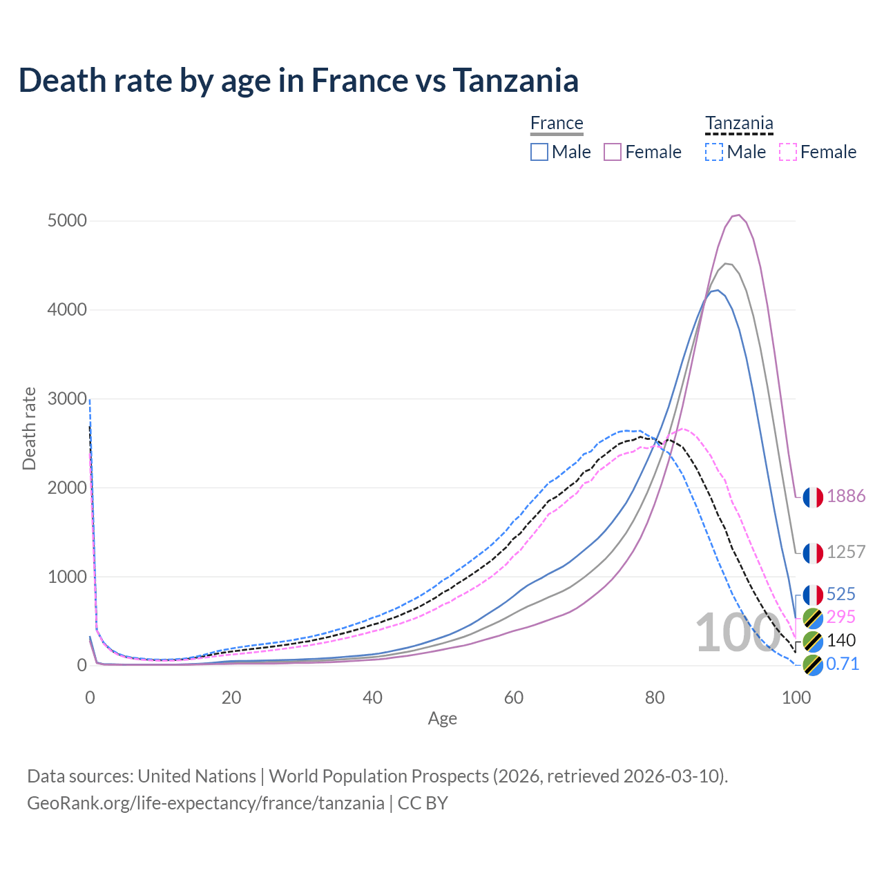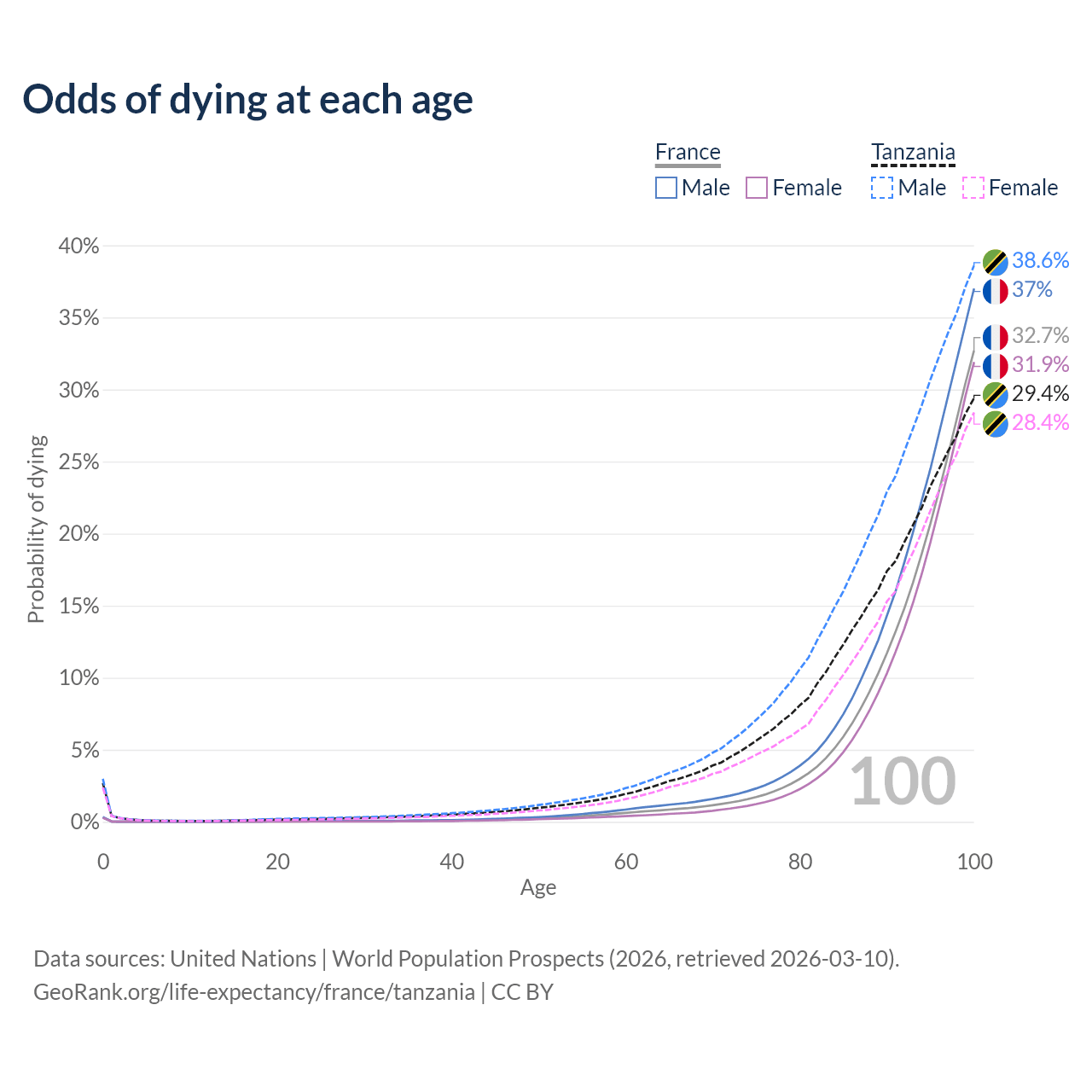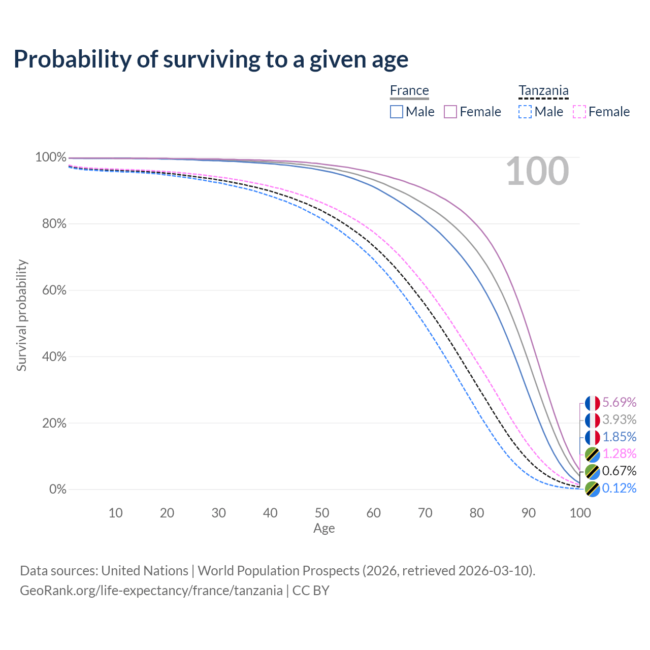 This life expectancy calculator shows the odds of living to 100, 95, 90, and below based on current age for both males and females in France and Tanzania, along with mean and median age of death. The calculations are based on the 2026 life tables (actuarial tables) from the UN World Population Prospects.