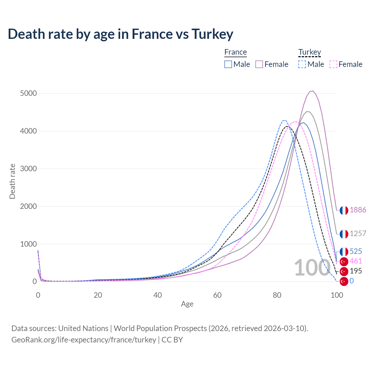 This life expectancy calculator shows the odds of living to 100, 95, 90, and below based on current age for both males and females in France and Turkey, along with mean and median age of death. The calculations are based on the 2026 life tables (actuarial tables) from the UN World Population Prospects.
