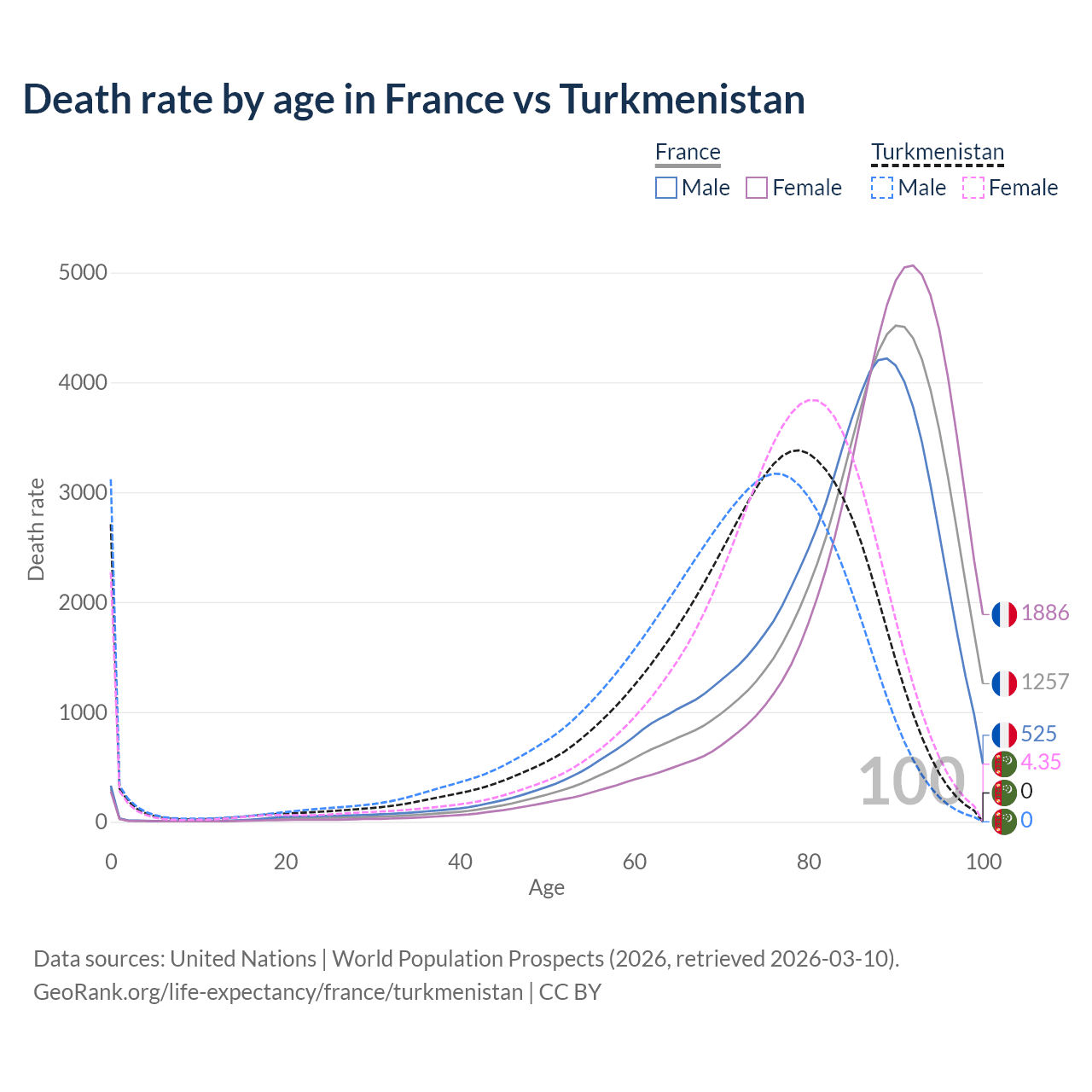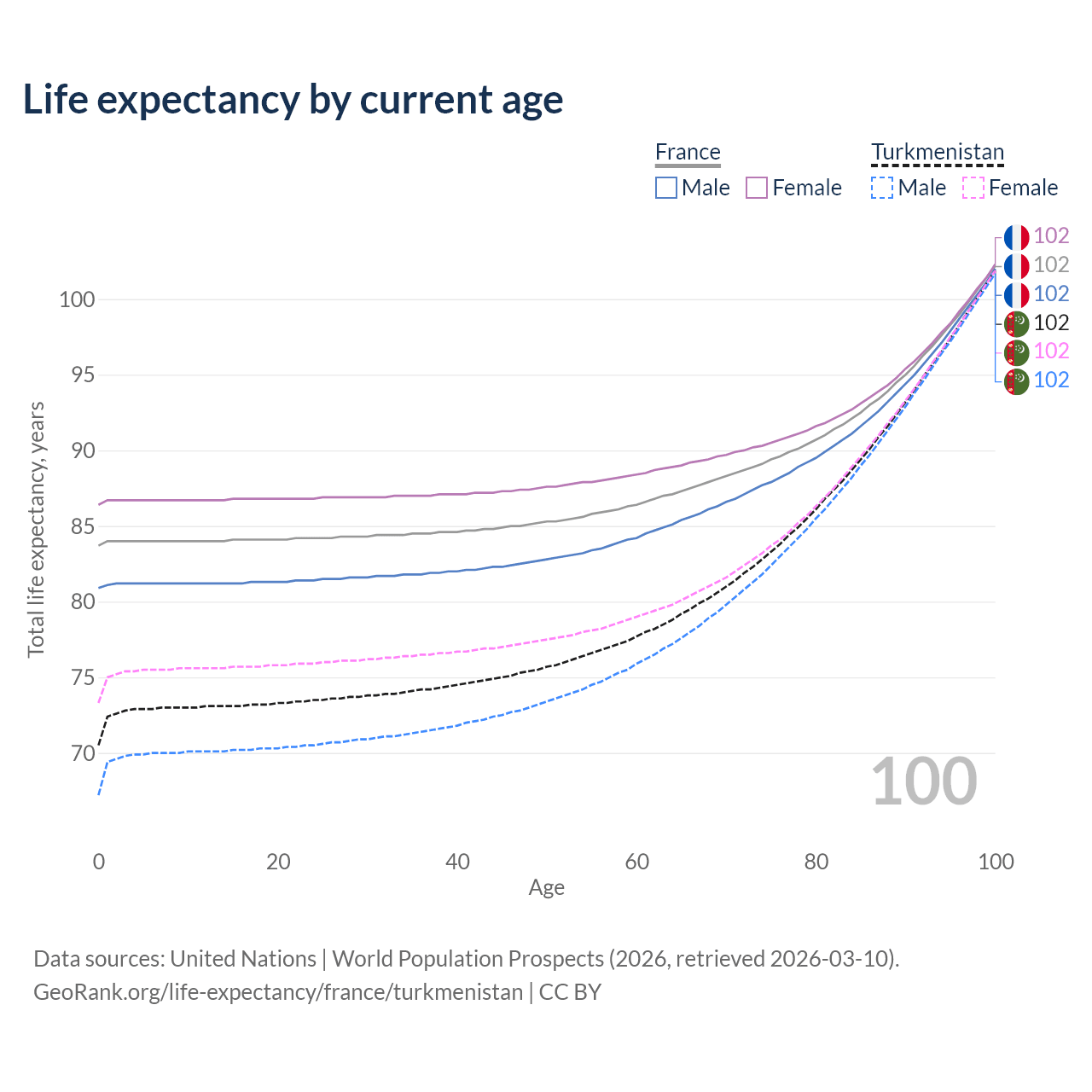 This life expectancy calculator shows the odds of living to 100, 95, 90, and below based on current age for both males and females in France and Turkmenistan, along with mean and median age of death. The calculations are based on the 2026 life tables (actuarial tables) from the UN World Population Prospects.