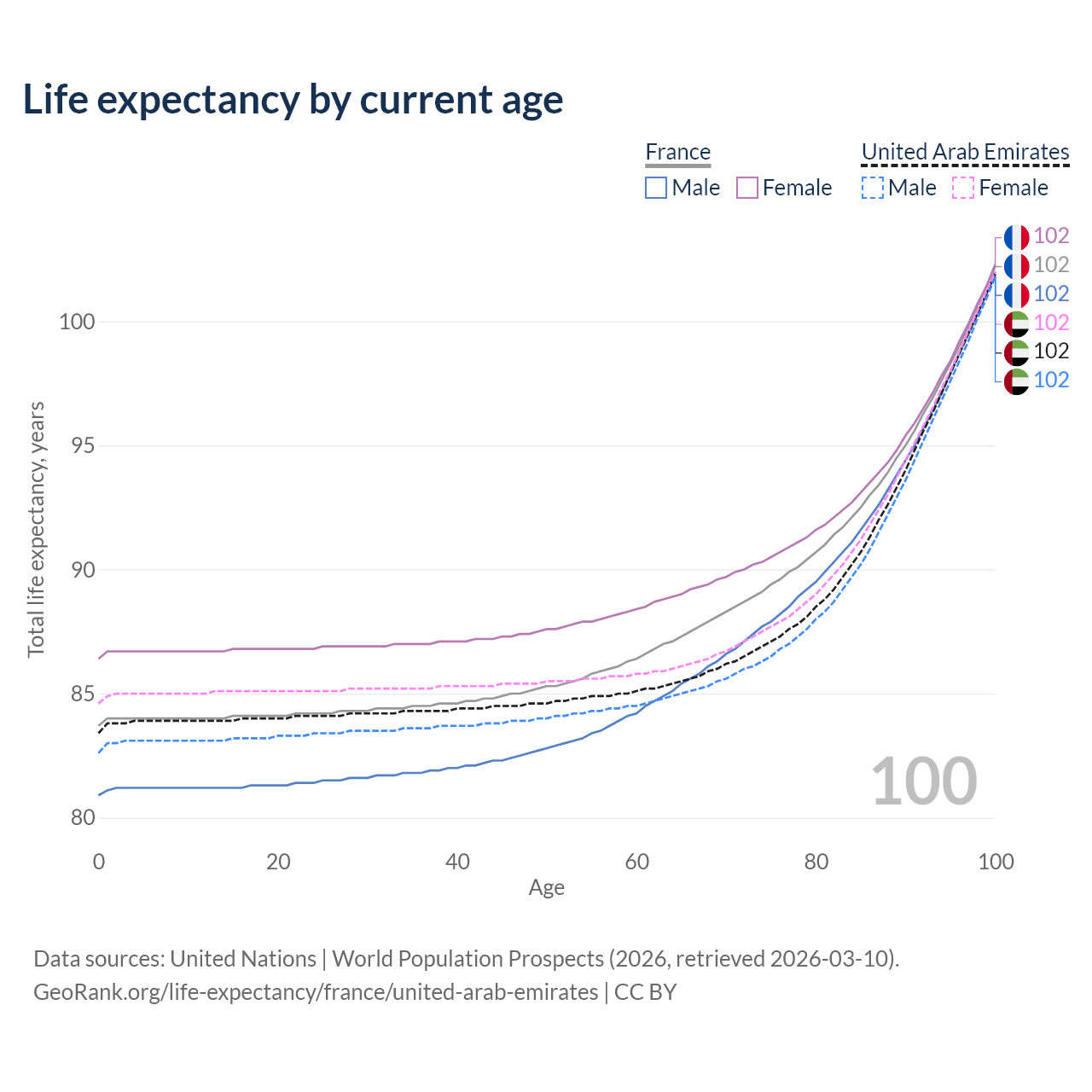 This life expectancy calculator shows the odds of living to 100, 95, 90, and below based on current age for both males and females in France and the United Arab Emirates, along with mean and median age of death. The calculations are based on the 2026 life tables (actuarial tables) from the UN World Population Prospects.