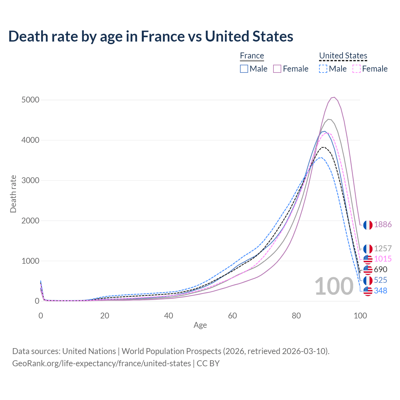 In France, the most common age of death is 90, compared to 89 in the United States. The median age of death is 87.4 in France and 83.9 in the United States, meaning only half of each cohort is expected to live past that age.