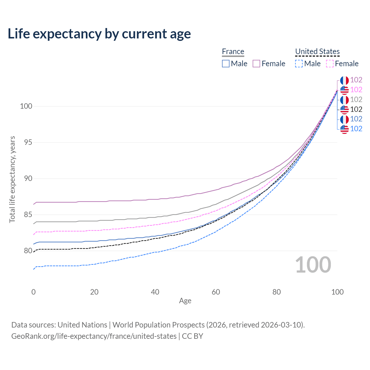 This life expectancy calculator shows the odds of living to 100, 95, 90, and below based on current age for both males and females in France and the United States, along with mean and median age of death. The calculations are based on the 2026 life tables (actuarial tables) from the UN World Population Prospects.