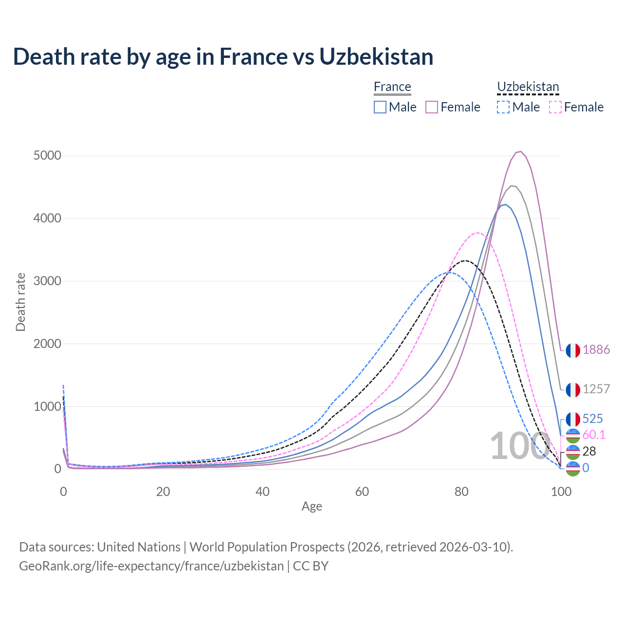 In France, the most common age of death is 90, compared to 81 in Uzbekistan. The median age of death is 87.4 in France and 76.4 in Uzbekistan, meaning only half of each cohort is expected to live past that age.