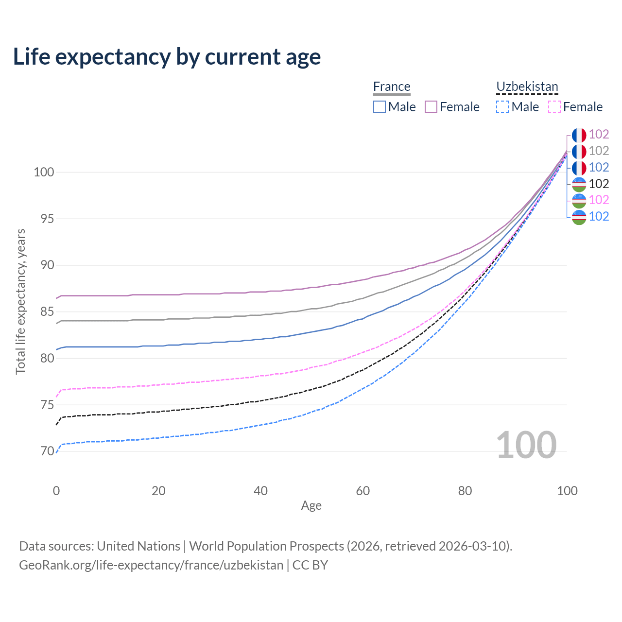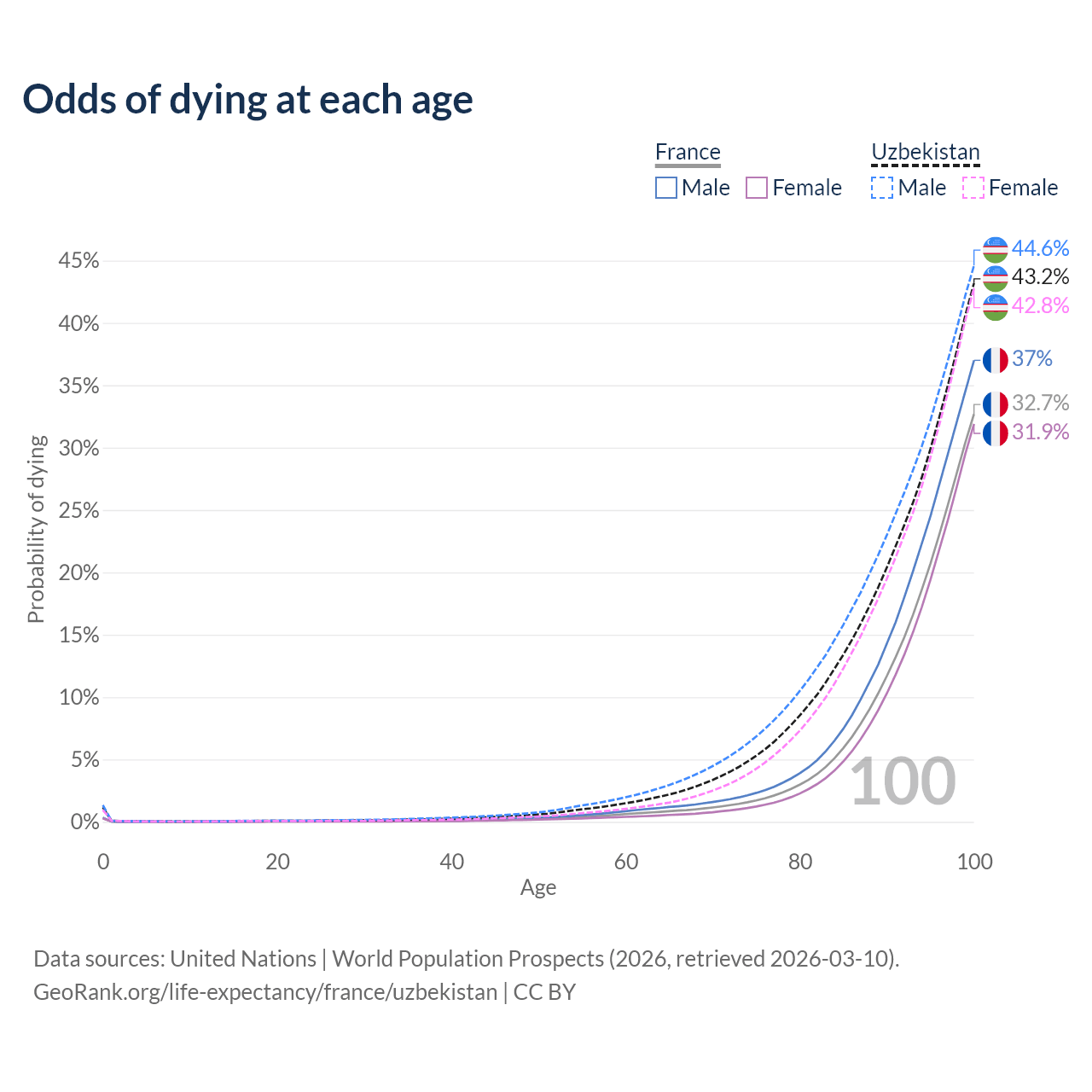 This life expectancy calculator shows the odds of living to 100, 95, 90, and below based on current age for both males and females in France and Uzbekistan, along with mean and median age of death. The calculations are based on the 2026 life tables (actuarial tables) from the UN World Population Prospects.
