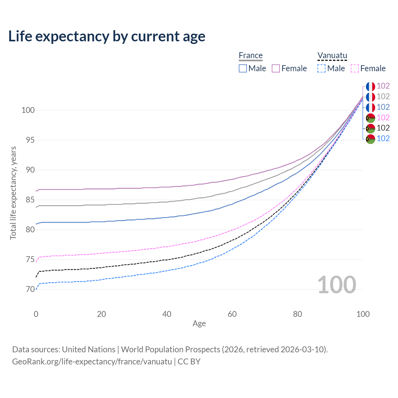 This life expectancy calculator shows the odds of living to 100, 95, 90, and below based on current age for both males and females in France and Vanuatu, along with mean and median age of death. The calculations are based on the 2026 life tables (actuarial tables) from the UN World Population Prospects.
