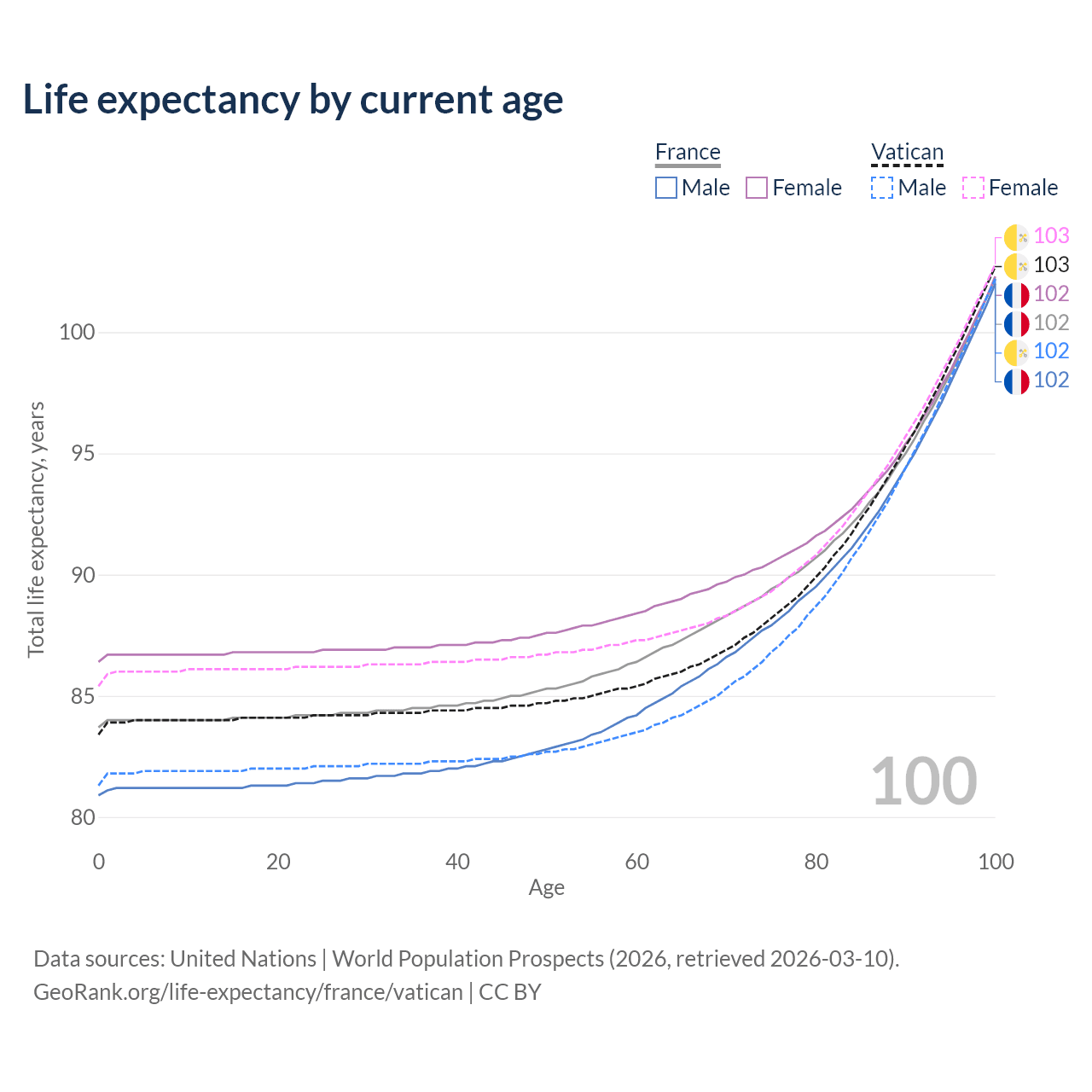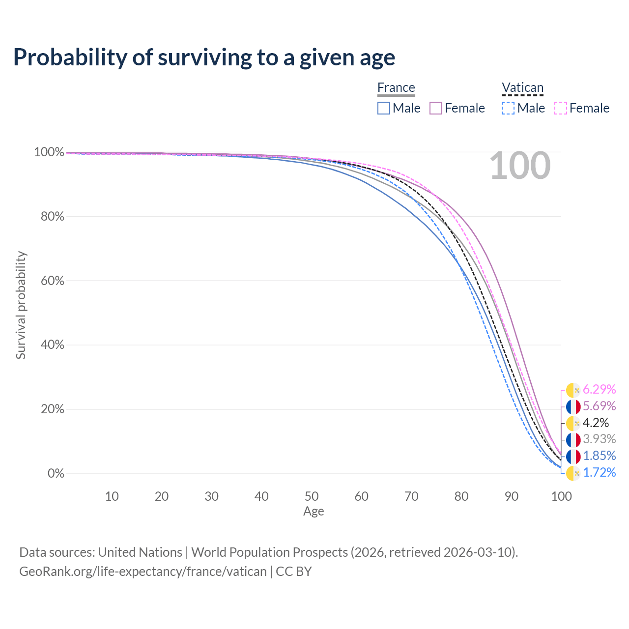 This life expectancy calculator shows the odds of living to 100, 95, 90, and below based on current age for both males and females in France and the Vatican, along with mean and median age of death. The calculations are based on the 2026 life tables (actuarial tables) from the UN World Population Prospects.