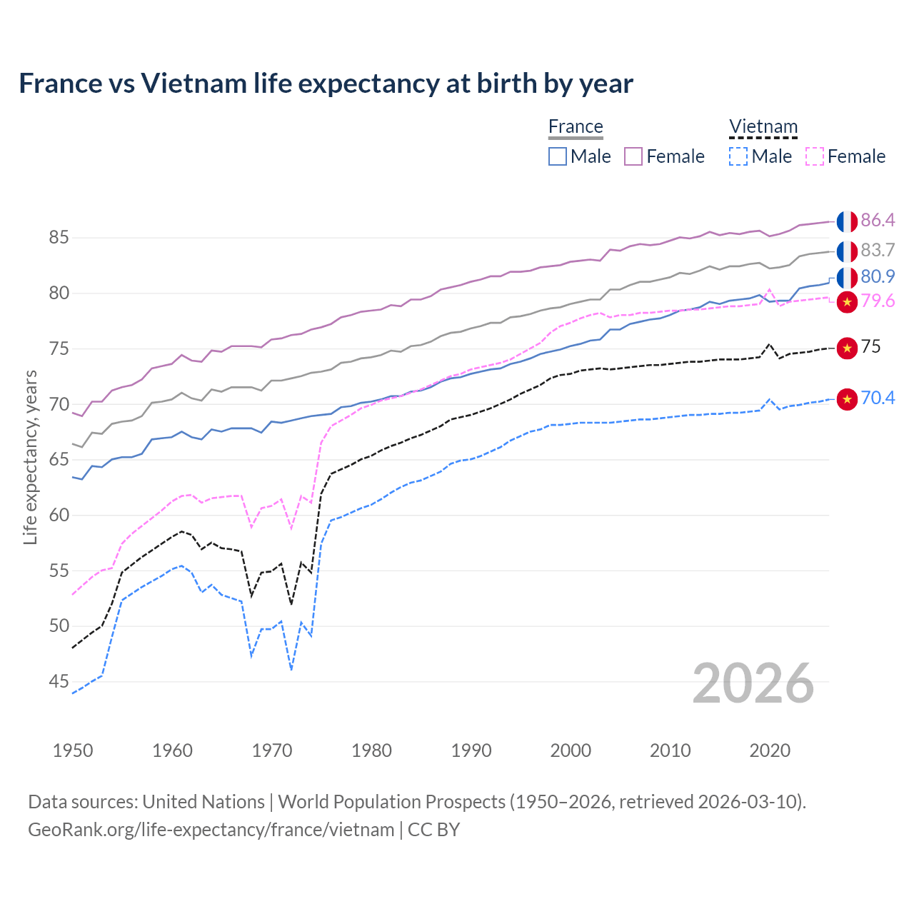The average life expectancy at birth is 83.7 years in France vs 75 in Vietnam. France is ranked 15/197 by life expectancy, and Vietnam is 93/197. In France, the life expectancy is 80.9 years for males and 86.4 years for females. In Vietnam, it's 70.4 years for males and 79.6 years for females.
