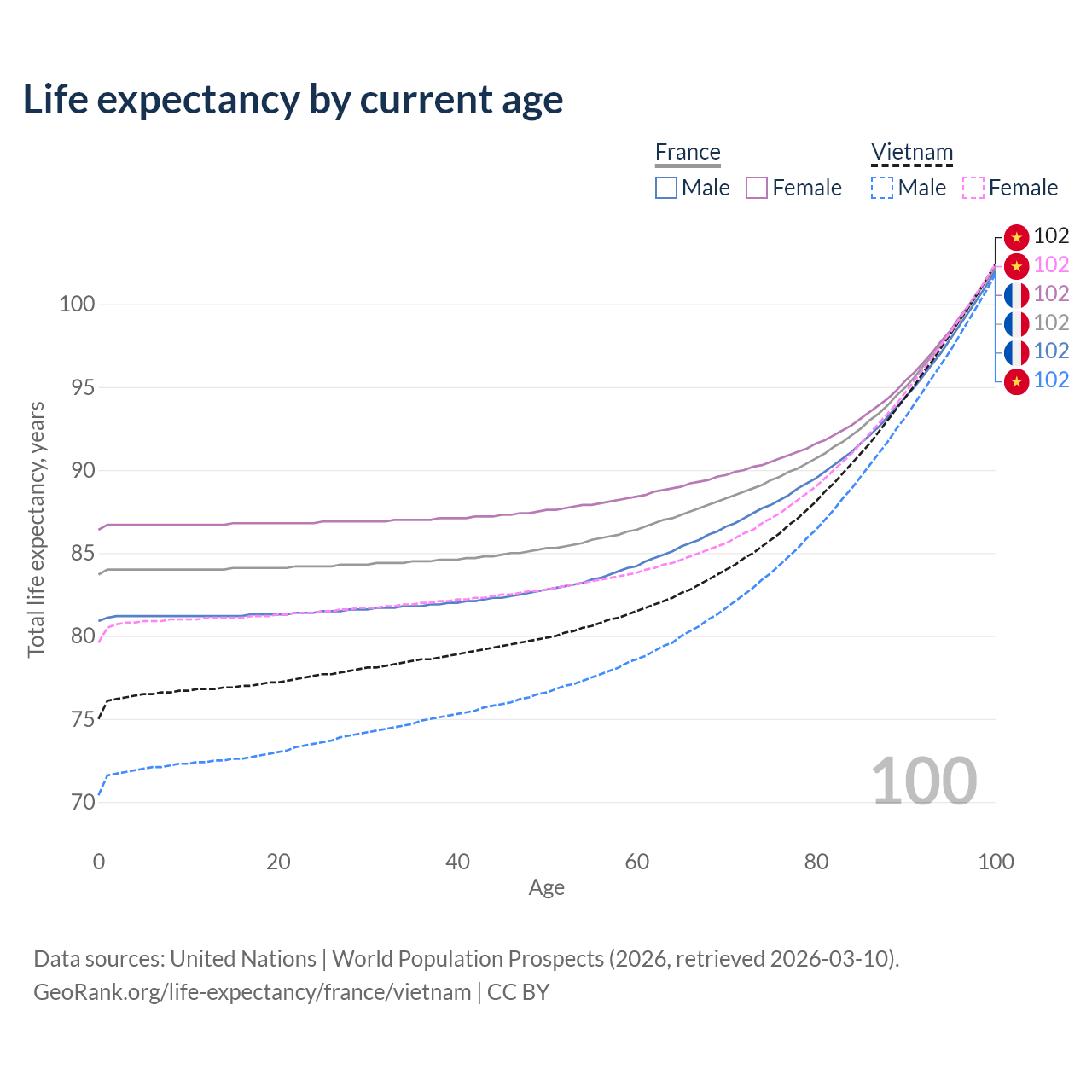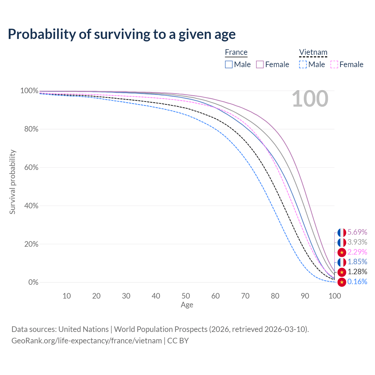 This life expectancy calculator shows the odds of living to 100, 95, 90, and below based on current age for both males and females in France and Vietnam, along with mean and median age of death. The calculations are based on the 2026 life tables (actuarial tables) from the UN World Population Prospects.
