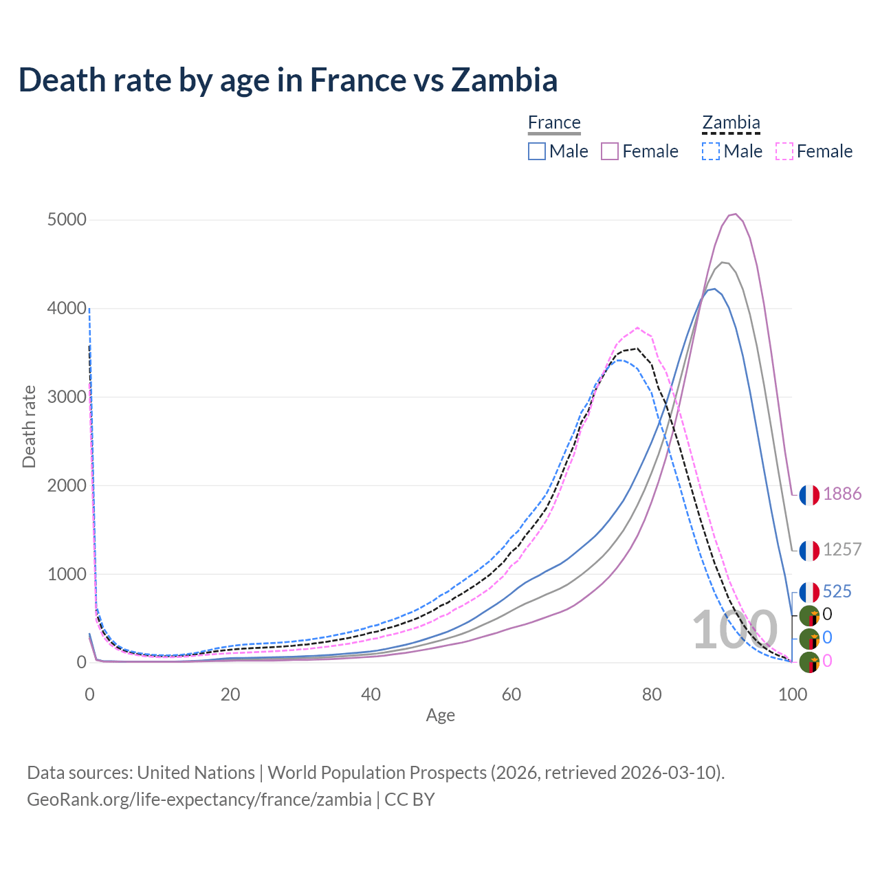 In France, the most common age of death is 90, compared to 0 in Zambia. The median age of death is 87.4 in France and 73.1 in Zambia, meaning only half of each cohort is expected to live past that age.