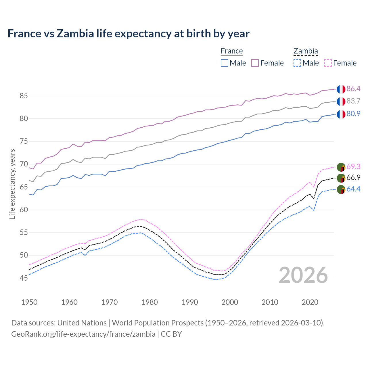 The average life expectancy at birth is 83.7 years in France vs 66.9 in Zambia. France is ranked 15/197 by life expectancy, and Zambia is 161/197. In France, the life expectancy is 80.9 years for males and 86.4 years for females. In Zambia, it's 64.4 years for males and 69.3 years for females.