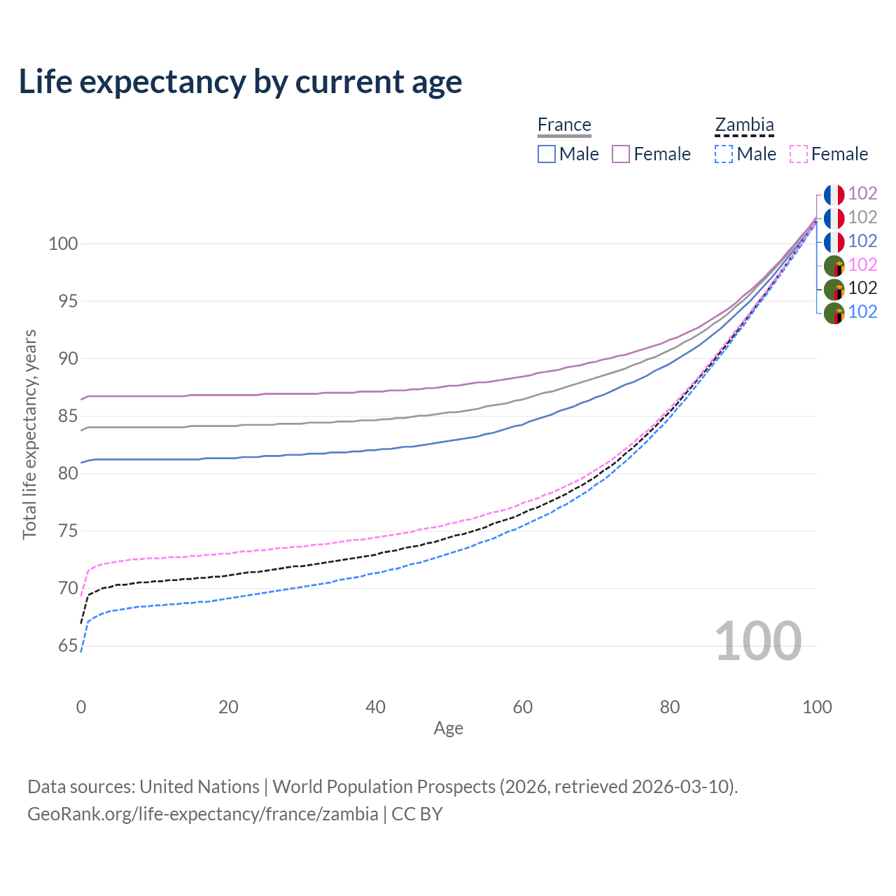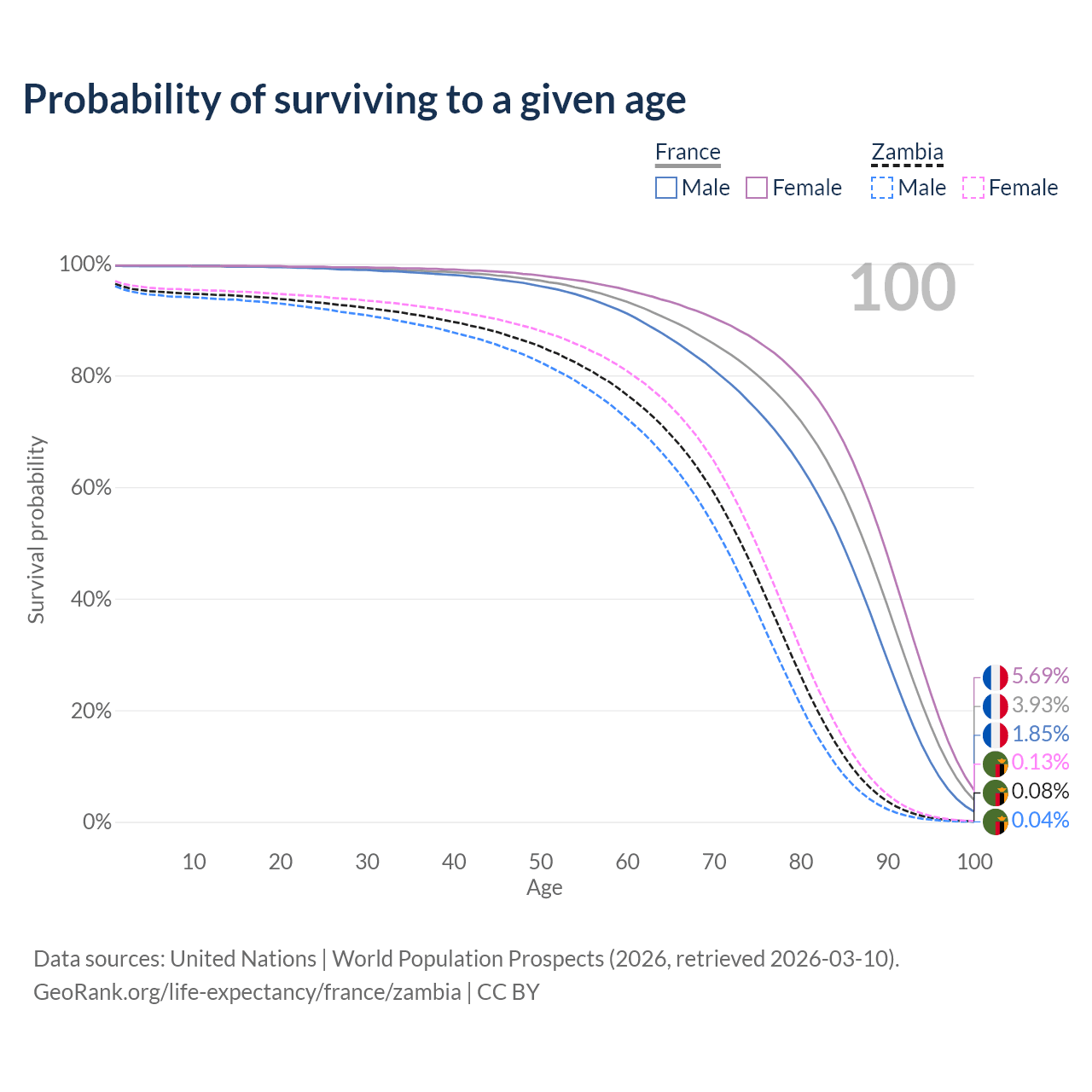 This life expectancy calculator shows the odds of living to 100, 95, 90, and below based on current age for both males and females in France and Zambia, along with mean and median age of death. The calculations are based on the 2026 life tables (actuarial tables) from the UN World Population Prospects.
