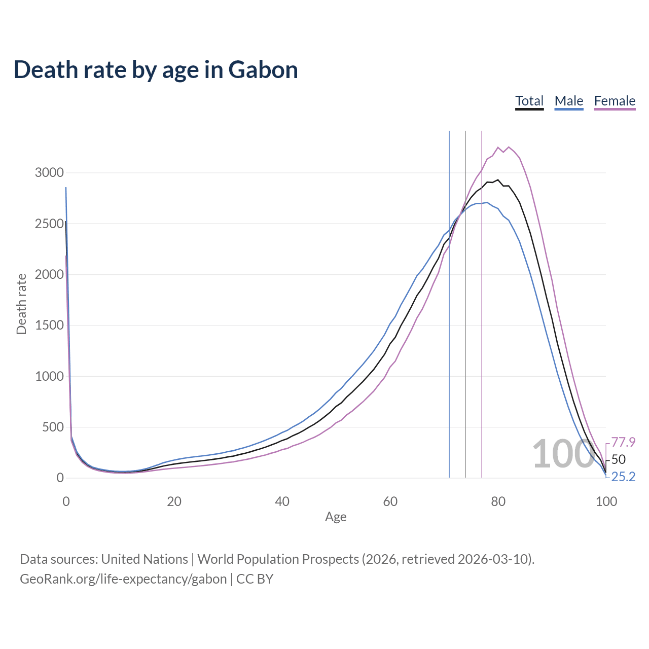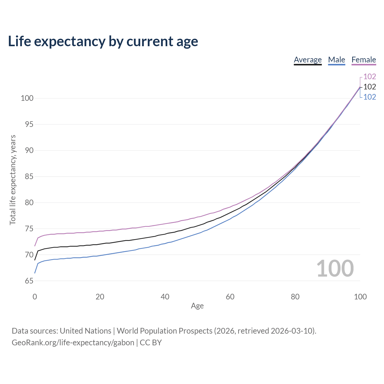 This life expectancy calculator shows the odds of living to 100, 95, 90, and below based on current age for both males and females in Gabon, along with mean and median age of death. The calculations are based on the 2026 life tables (actuarial tables) from the UN World Population Prospects.