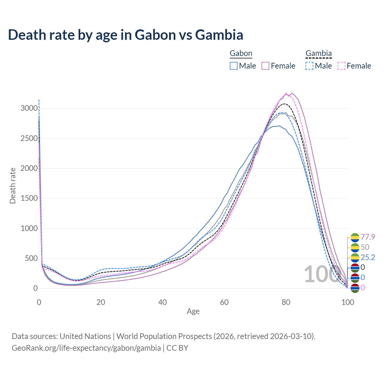 In Gabon, the most common age of death is 80, compared to 80 in the Gambia. The median age of death is 73.9 in Gabon and 73.4 in the Gambia, meaning only half of each cohort is expected to live past that age.