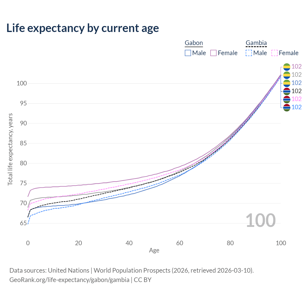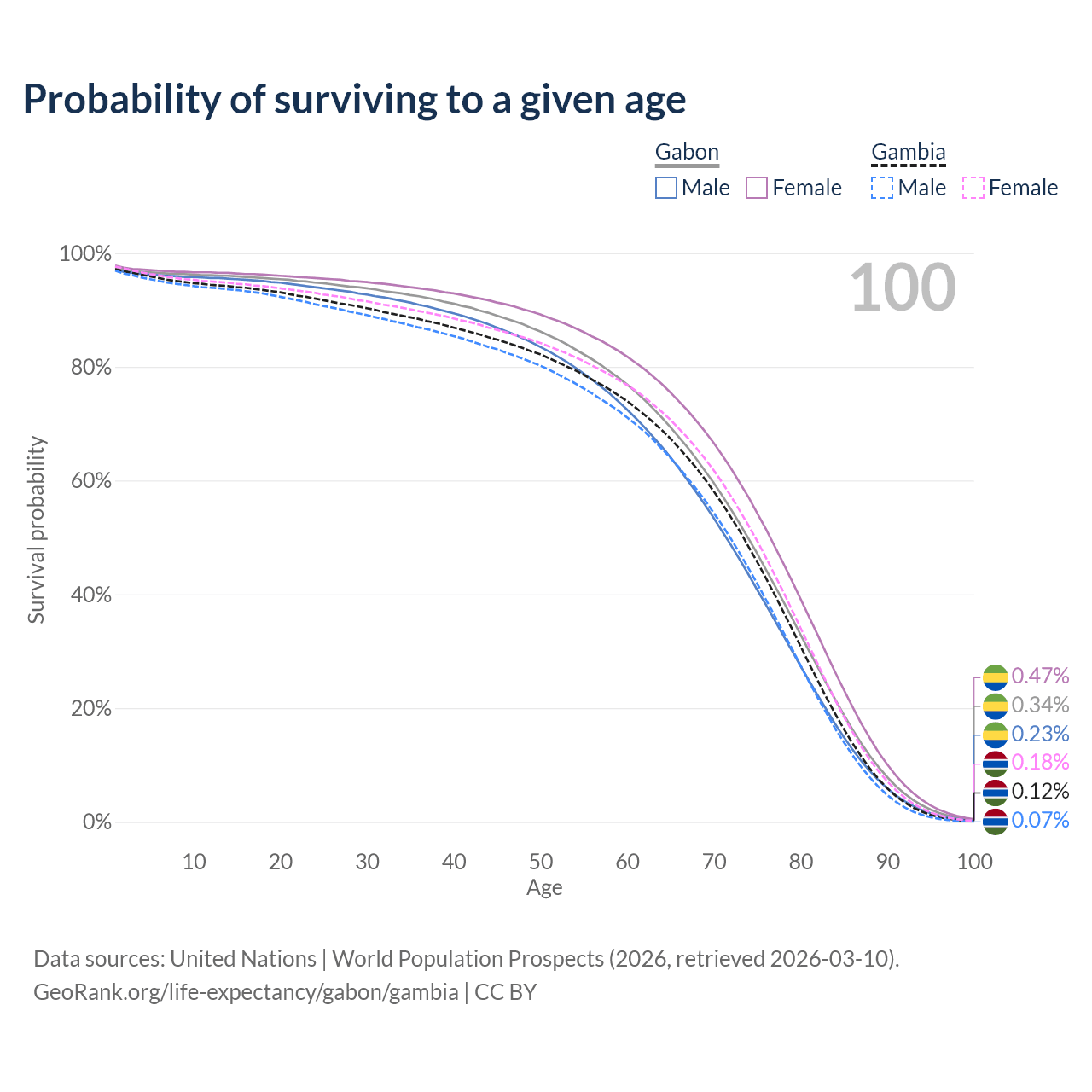 This life expectancy calculator shows the odds of living to 100, 95, 90, and below based on current age for both males and females in Gabon and the Gambia, along with mean and median age of death. The calculations are based on the 2026 life tables (actuarial tables) from the UN World Population Prospects.