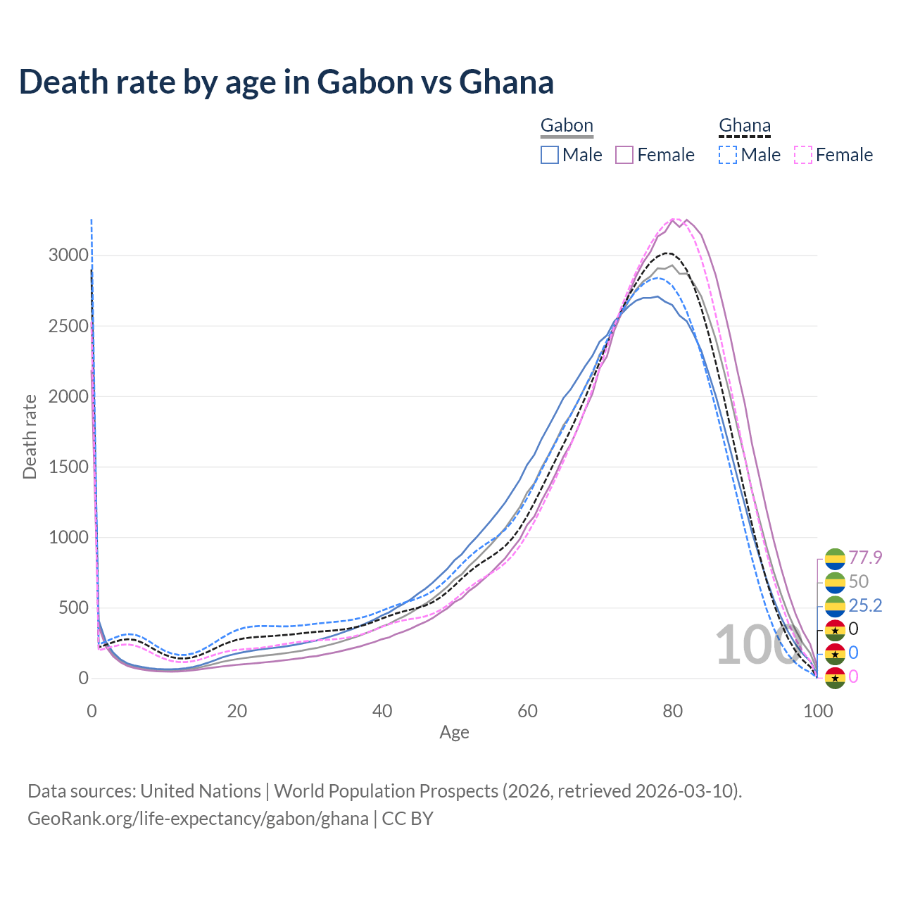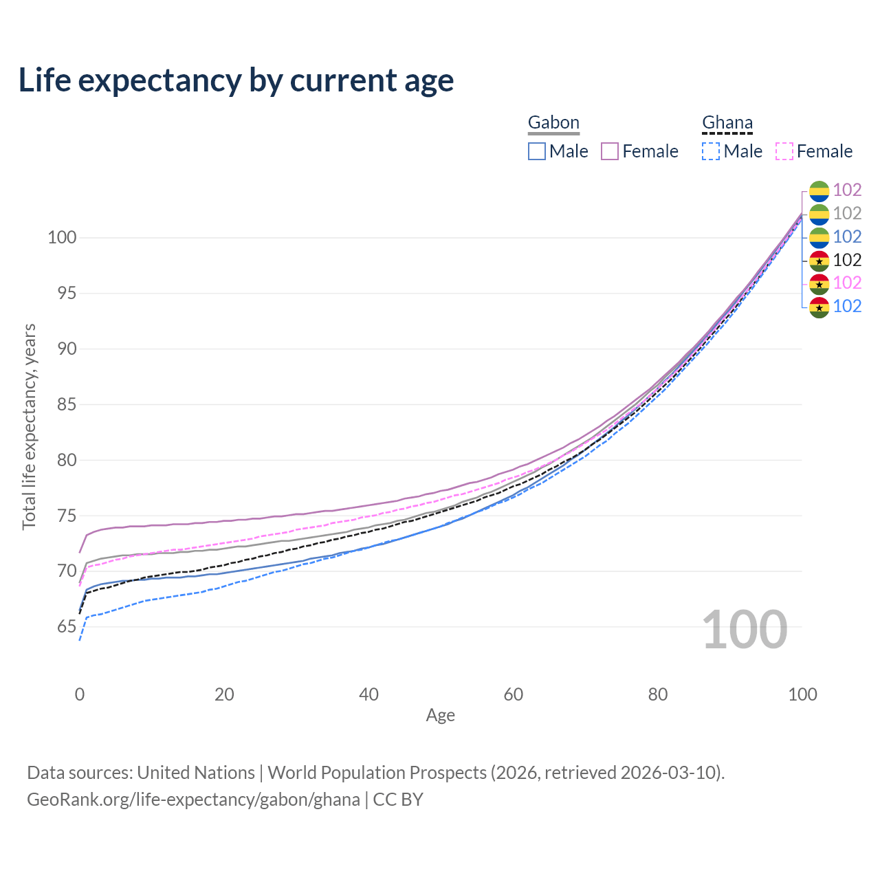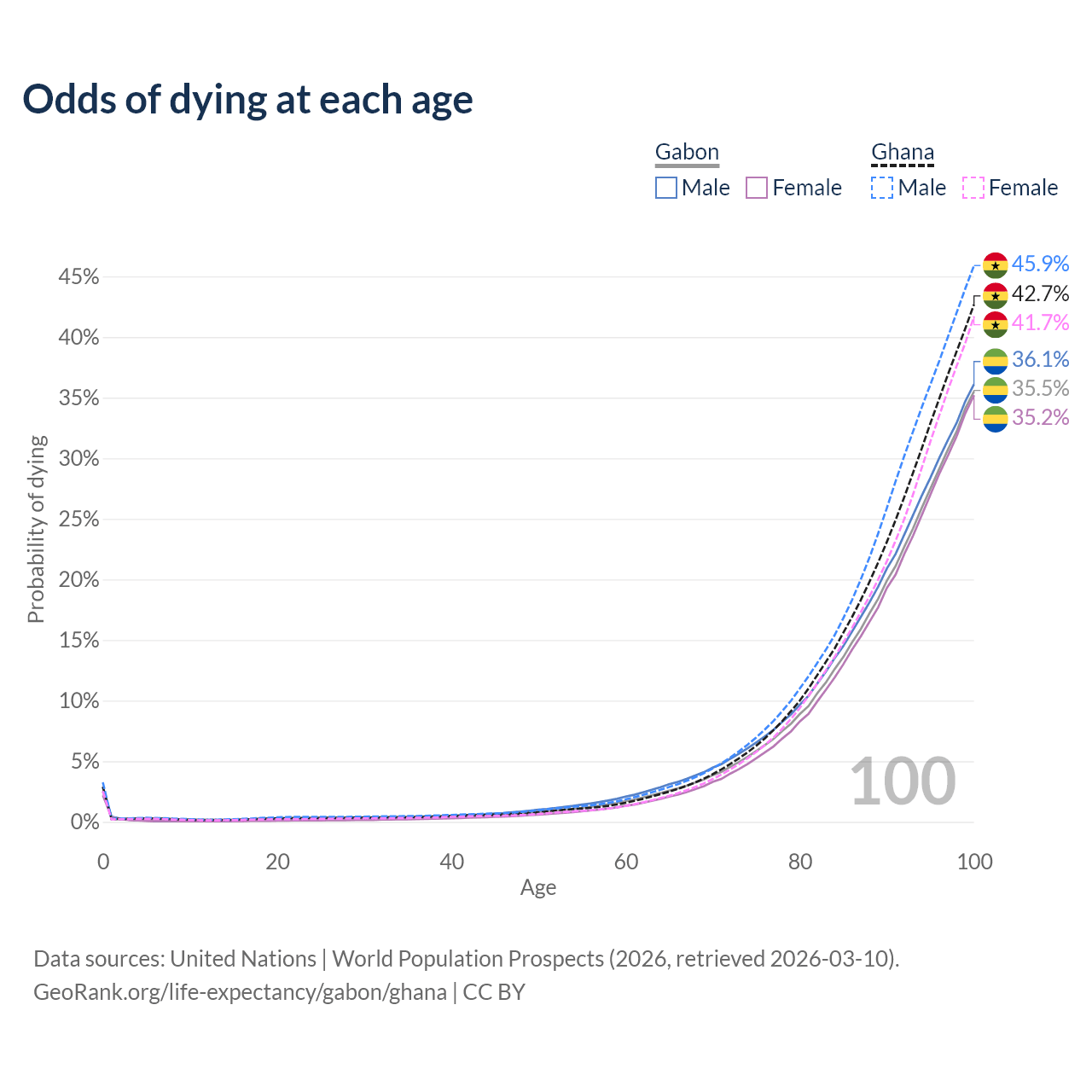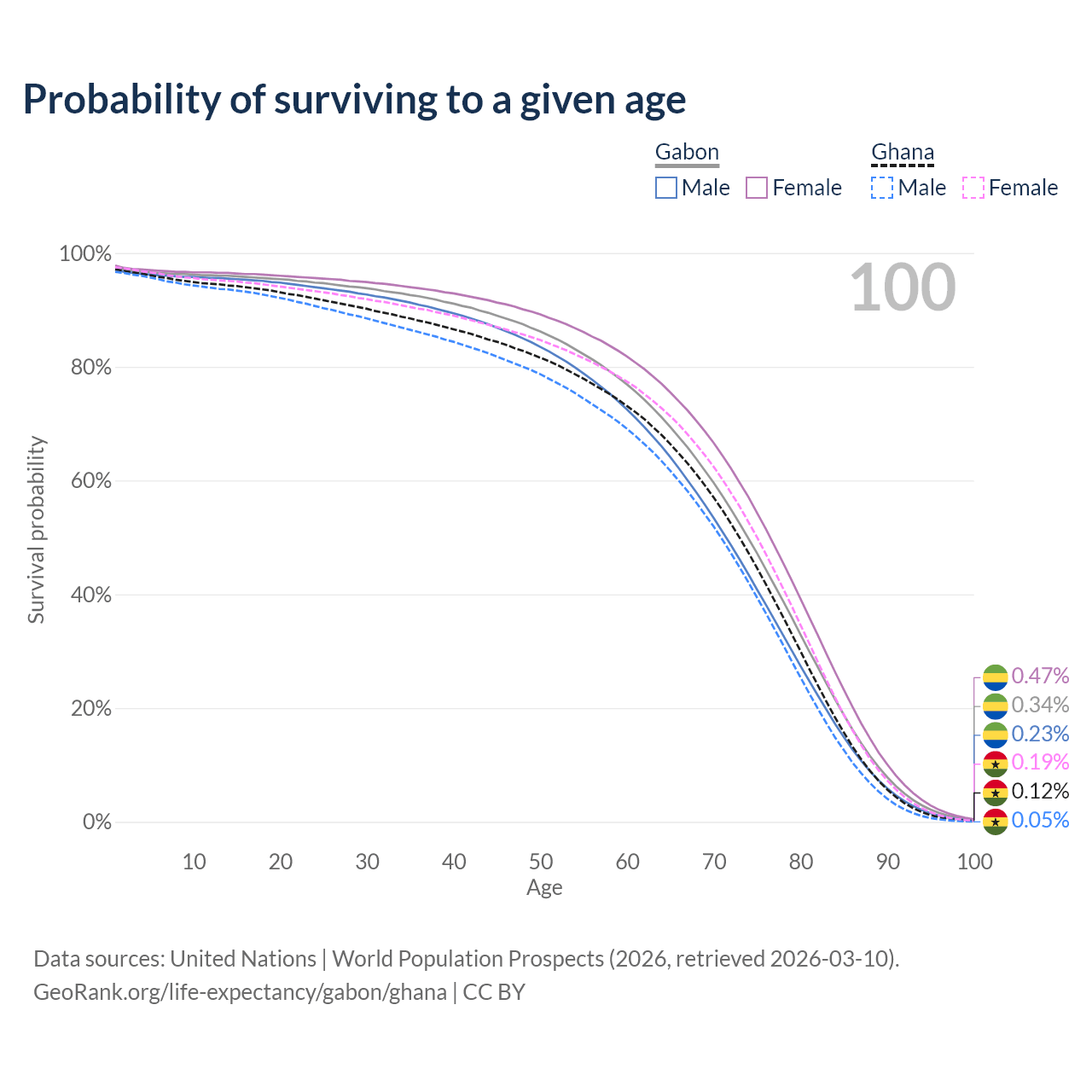 This life expectancy calculator shows the odds of living to 100, 95, 90, and below based on current age for both males and females in Gabon and Ghana, along with mean and median age of death. The calculations are based on the 2026 life tables (actuarial tables) from the UN World Population Prospects.