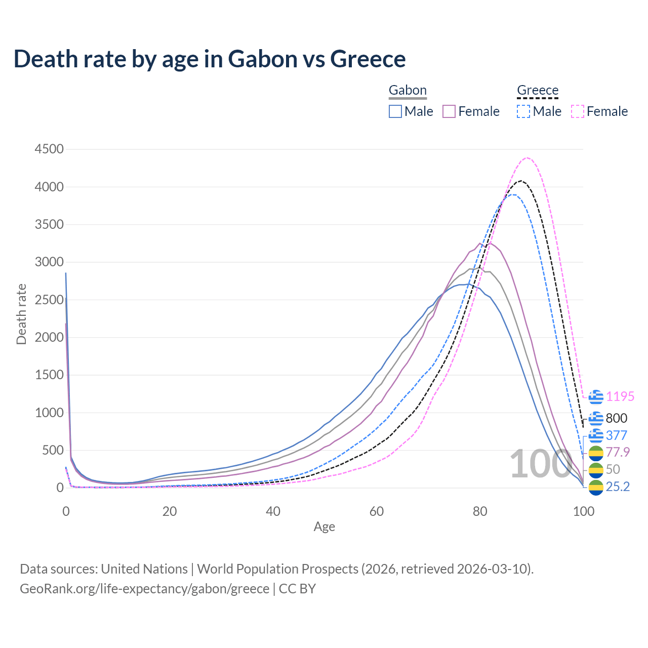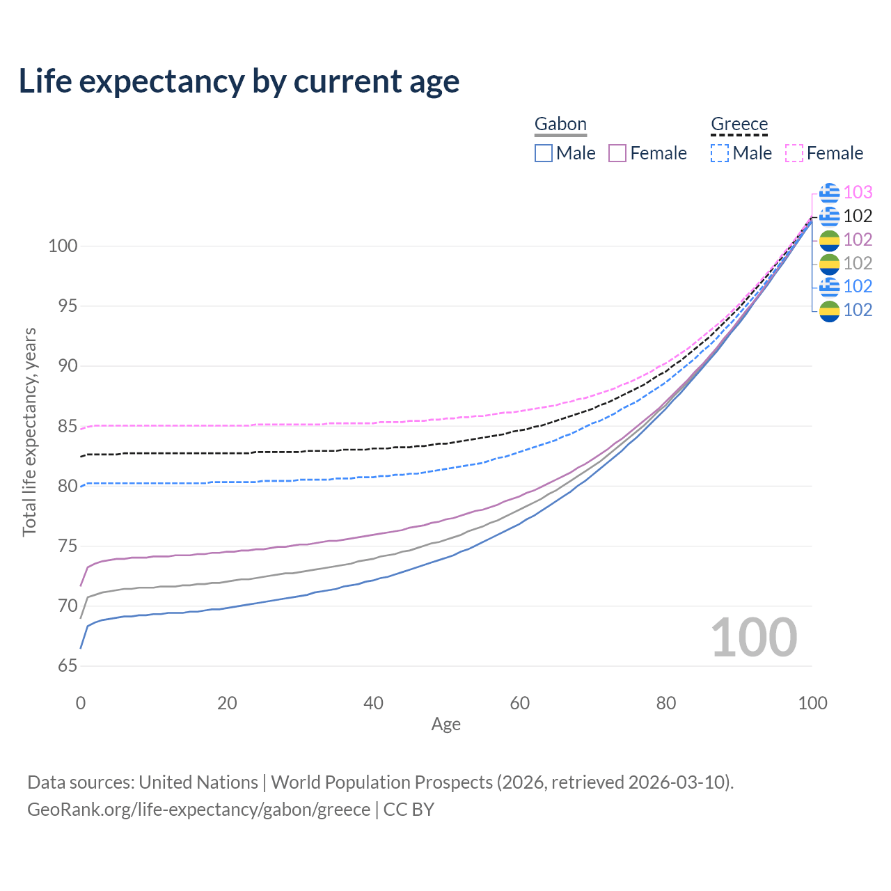 This life expectancy calculator shows the odds of living to 100, 95, 90, and below based on current age for both males and females in Gabon and Greece, along with mean and median age of death. The calculations are based on the 2026 life tables (actuarial tables) from the UN World Population Prospects.