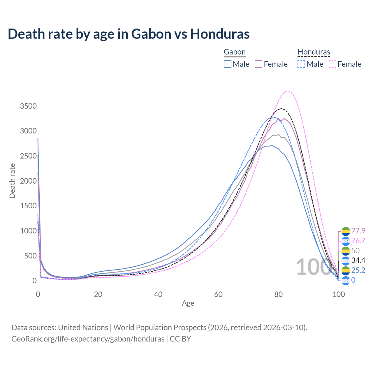 In Gabon, the most common age of death is 80, compared to 81 in Honduras. The median age of death is 73.9 in Gabon and 77.1 in Honduras, meaning only half of each cohort is expected to live past that age.