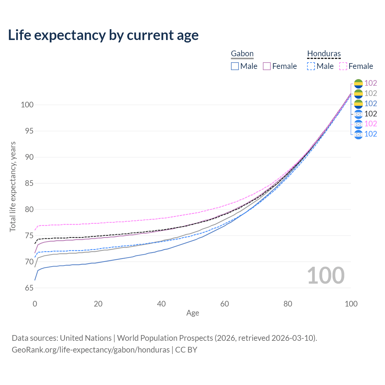 This life expectancy calculator shows the odds of living to 100, 95, 90, and below based on current age for both males and females in Gabon and Honduras, along with mean and median age of death. The calculations are based on the 2026 life tables (actuarial tables) from the UN World Population Prospects.