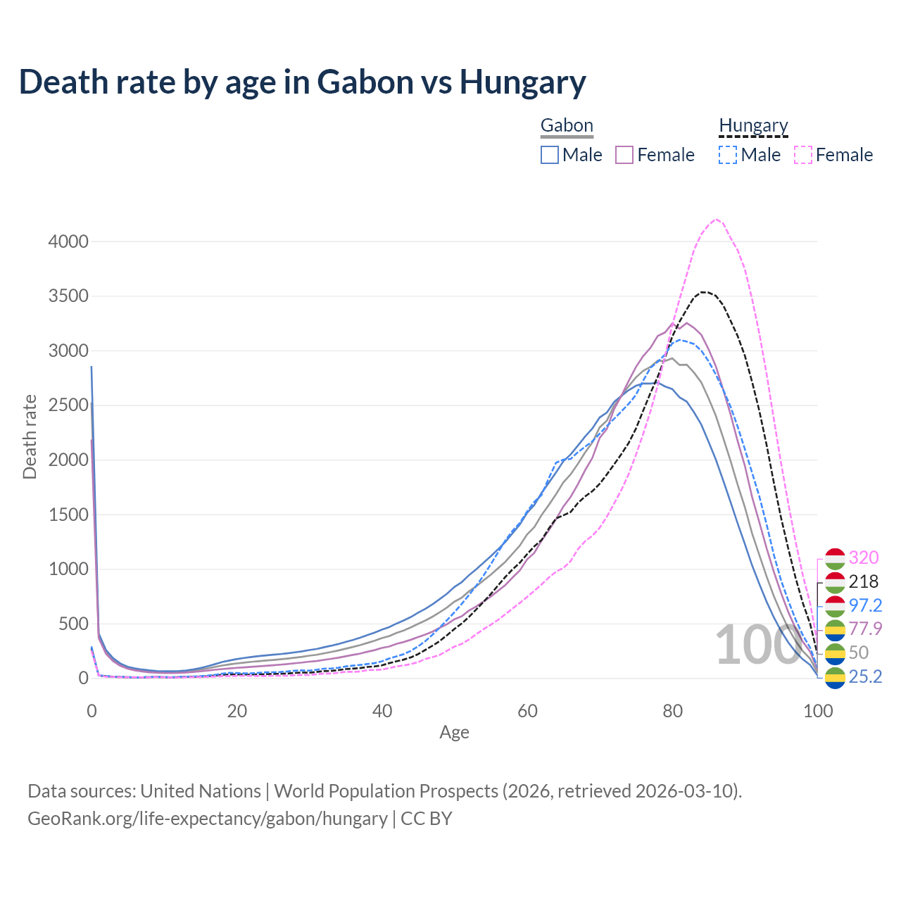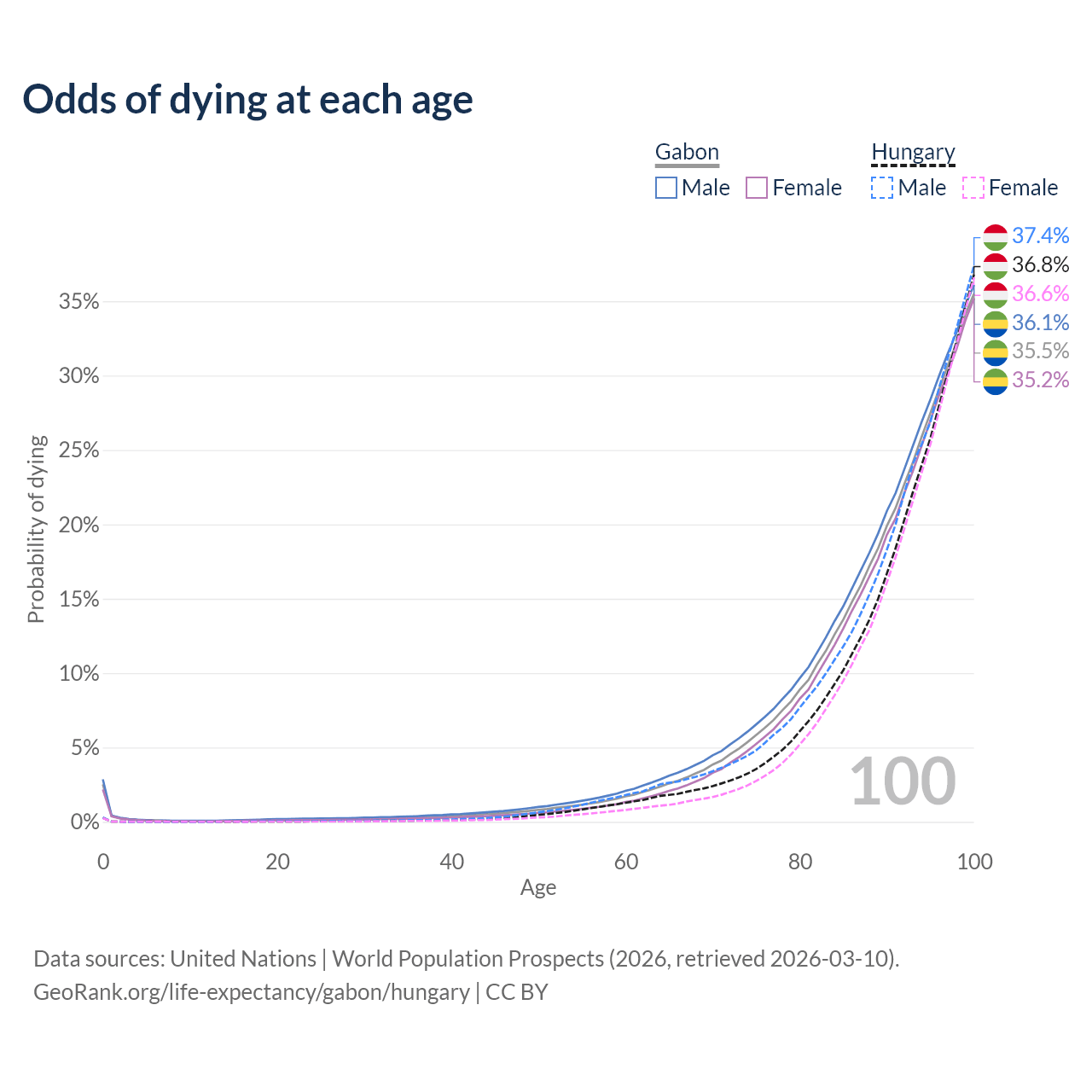 This life expectancy calculator shows the odds of living to 100, 95, 90, and below based on current age for both males and females in Gabon and Hungary, along with mean and median age of death. The calculations are based on the 2026 life tables (actuarial tables) from the UN World Population Prospects.