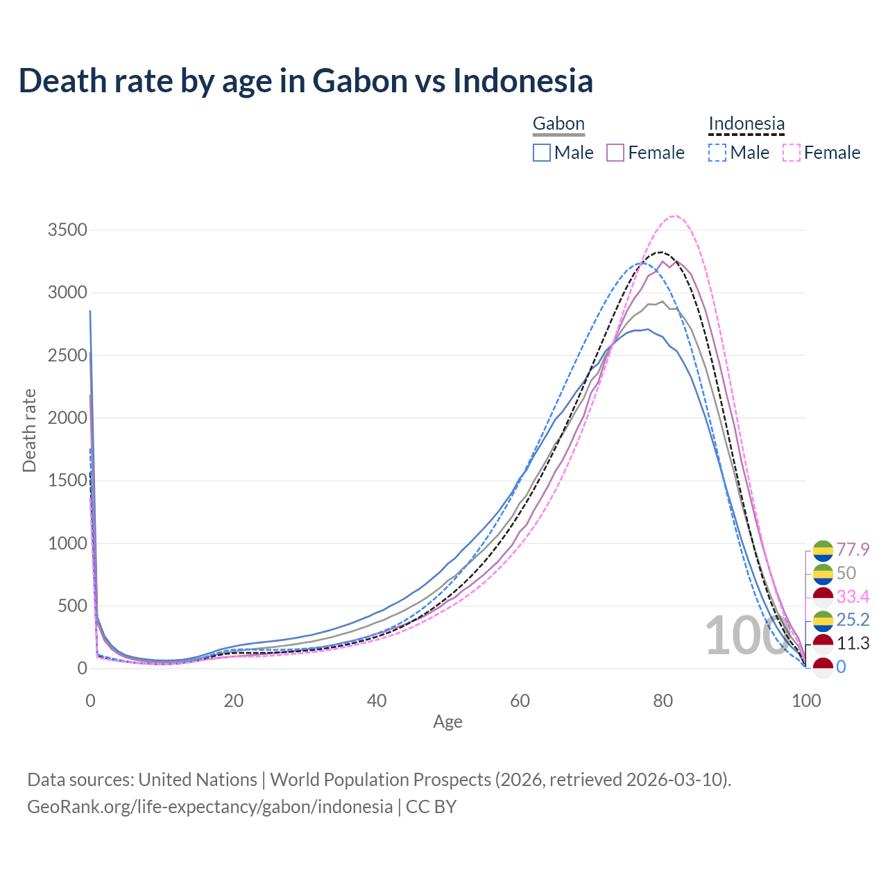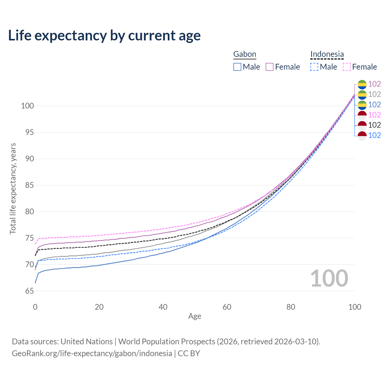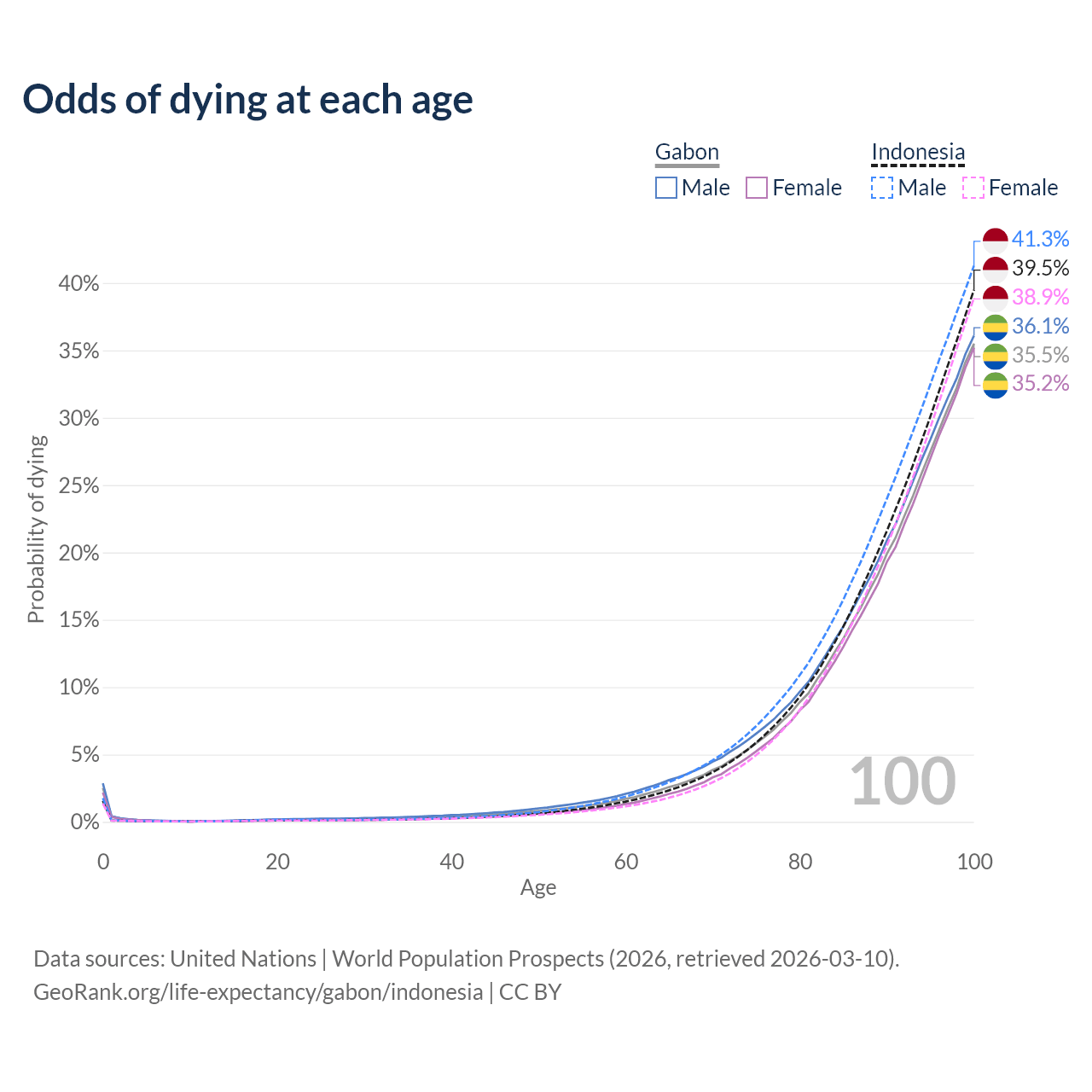 This life expectancy calculator shows the odds of living to 100, 95, 90, and below based on current age for both males and females in Gabon and Indonesia, along with mean and median age of death. The calculations are based on the 2026 life tables (actuarial tables) from the UN World Population Prospects.