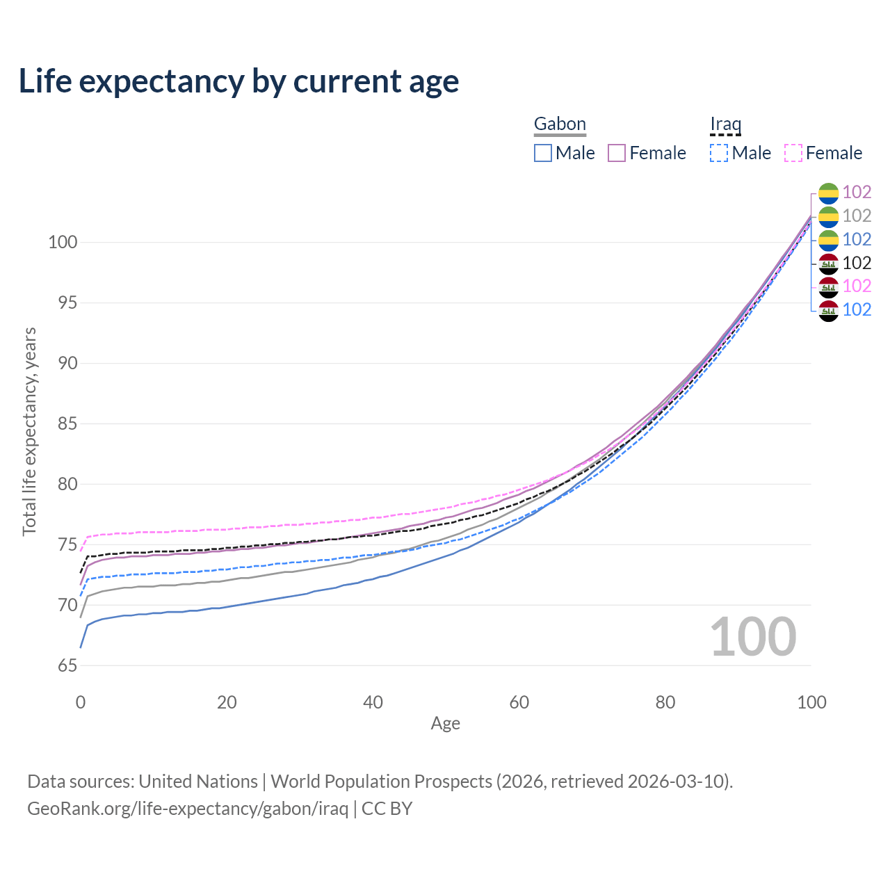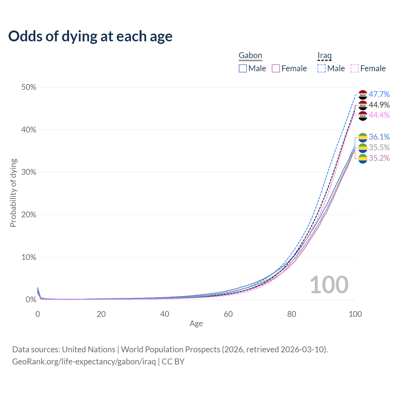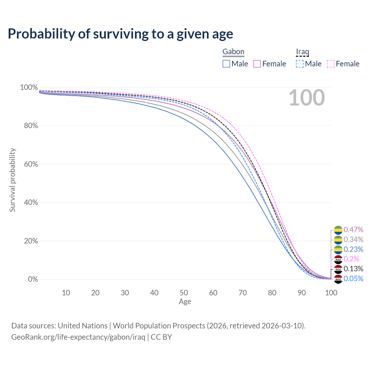This life expectancy calculator shows the odds of living to 100, 95, 90, and below based on current age for both males and females in Gabon and Iraq, along with mean and median age of death. The calculations are based on the 2026 life tables (actuarial tables) from the UN World Population Prospects.