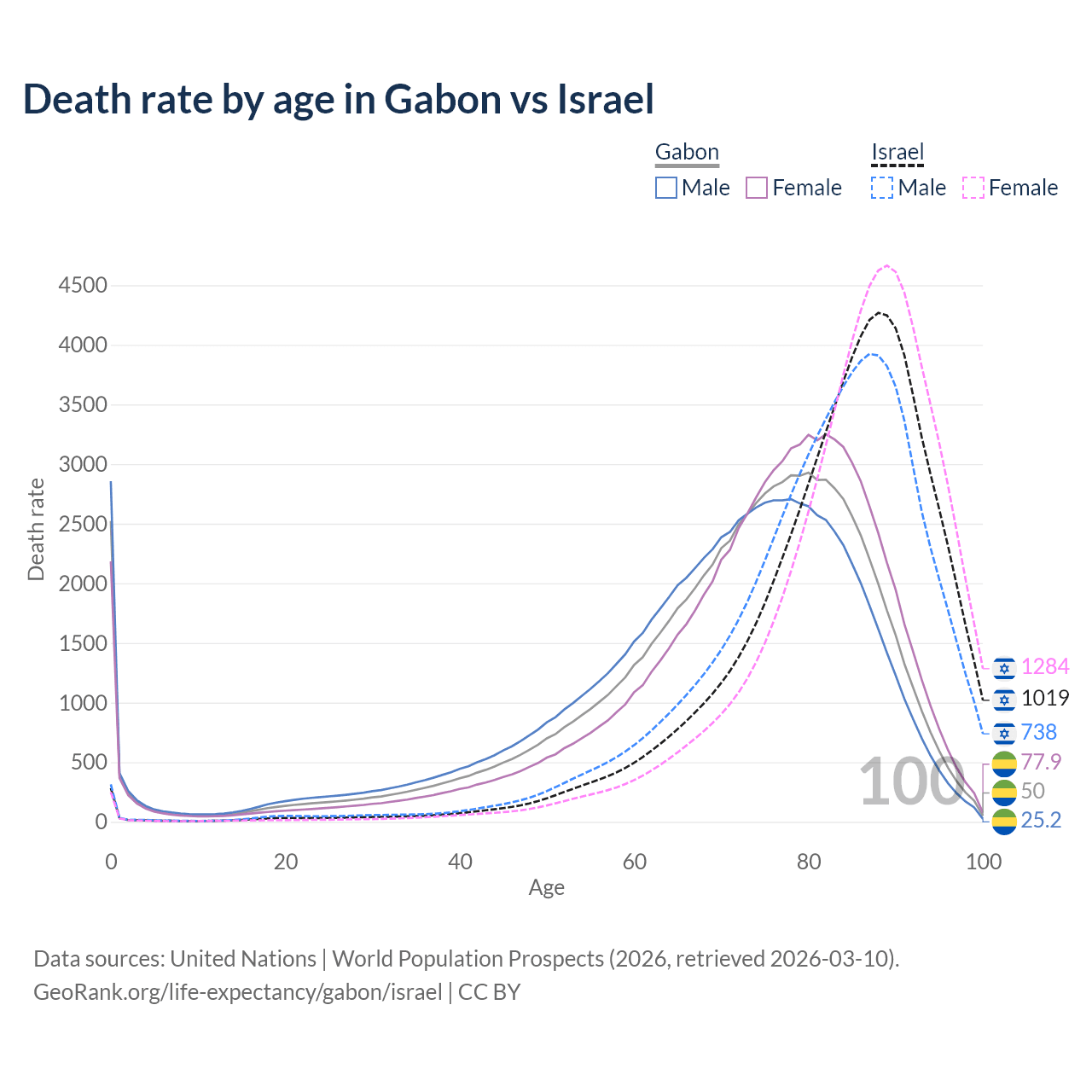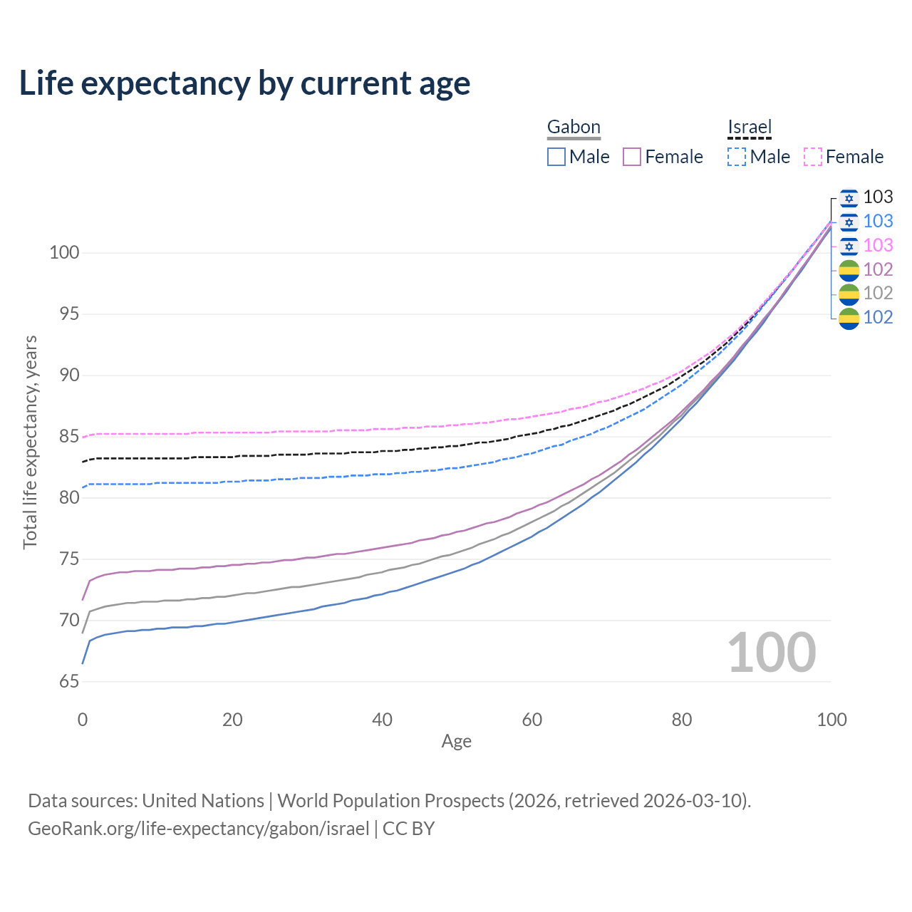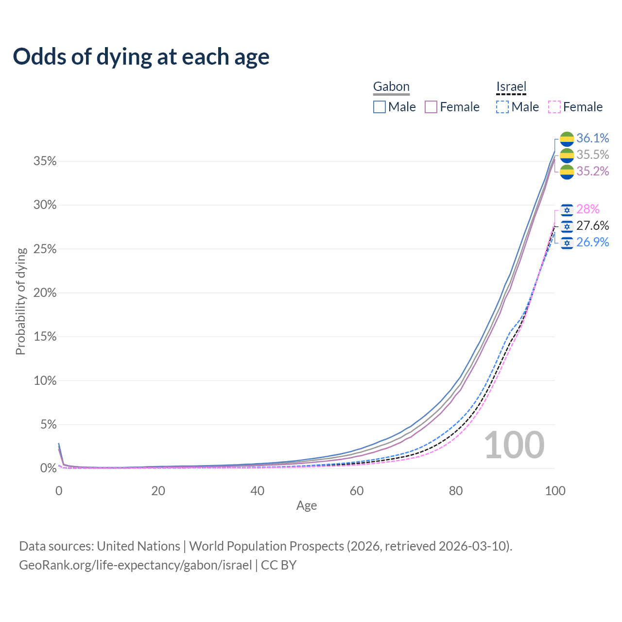 This life expectancy calculator shows the odds of living to 100, 95, 90, and below based on current age for both males and females in Gabon and Israel, along with mean and median age of death. The calculations are based on the 2026 life tables (actuarial tables) from the UN World Population Prospects.