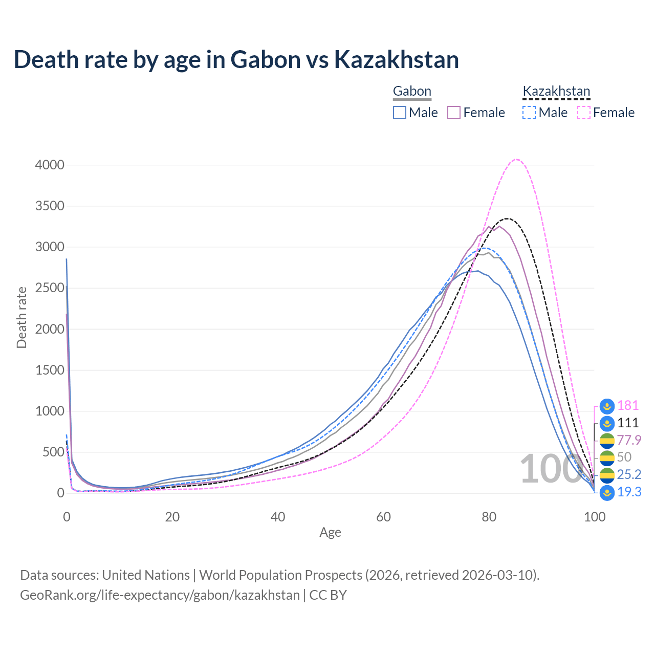 This life expectancy calculator shows the odds of living to 100, 95, 90, and below based on current age for both males and females in Gabon and Kazakhstan, along with mean and median age of death. The calculations are based on the 2026 life tables (actuarial tables) from the UN World Population Prospects.