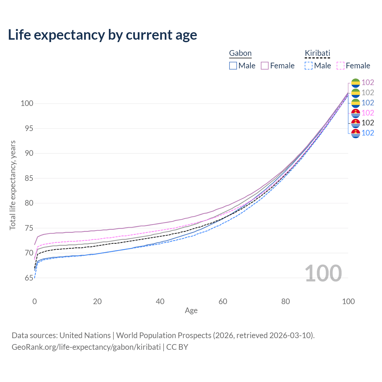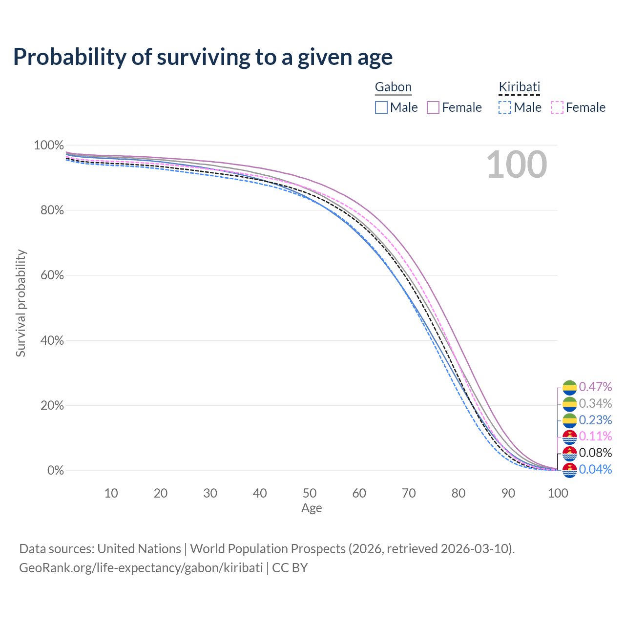 This life expectancy calculator shows the odds of living to 100, 95, 90, and below based on current age for both males and females in Gabon and Kiribati, along with mean and median age of death. The calculations are based on the 2026 life tables (actuarial tables) from the UN World Population Prospects.