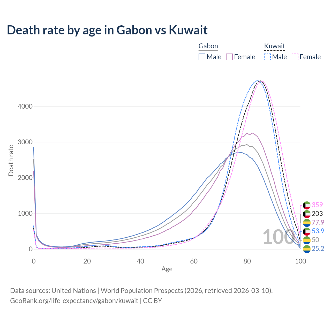 This life expectancy calculator shows the odds of living to 100, 95, 90, and below based on current age for both males and females in Gabon and Kuwait, along with mean and median age of death. The calculations are based on the 2026 life tables (actuarial tables) from the UN World Population Prospects.