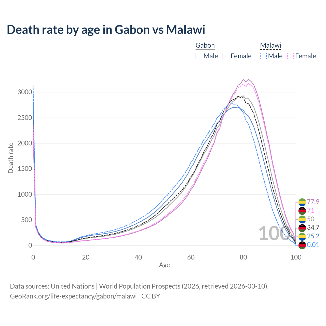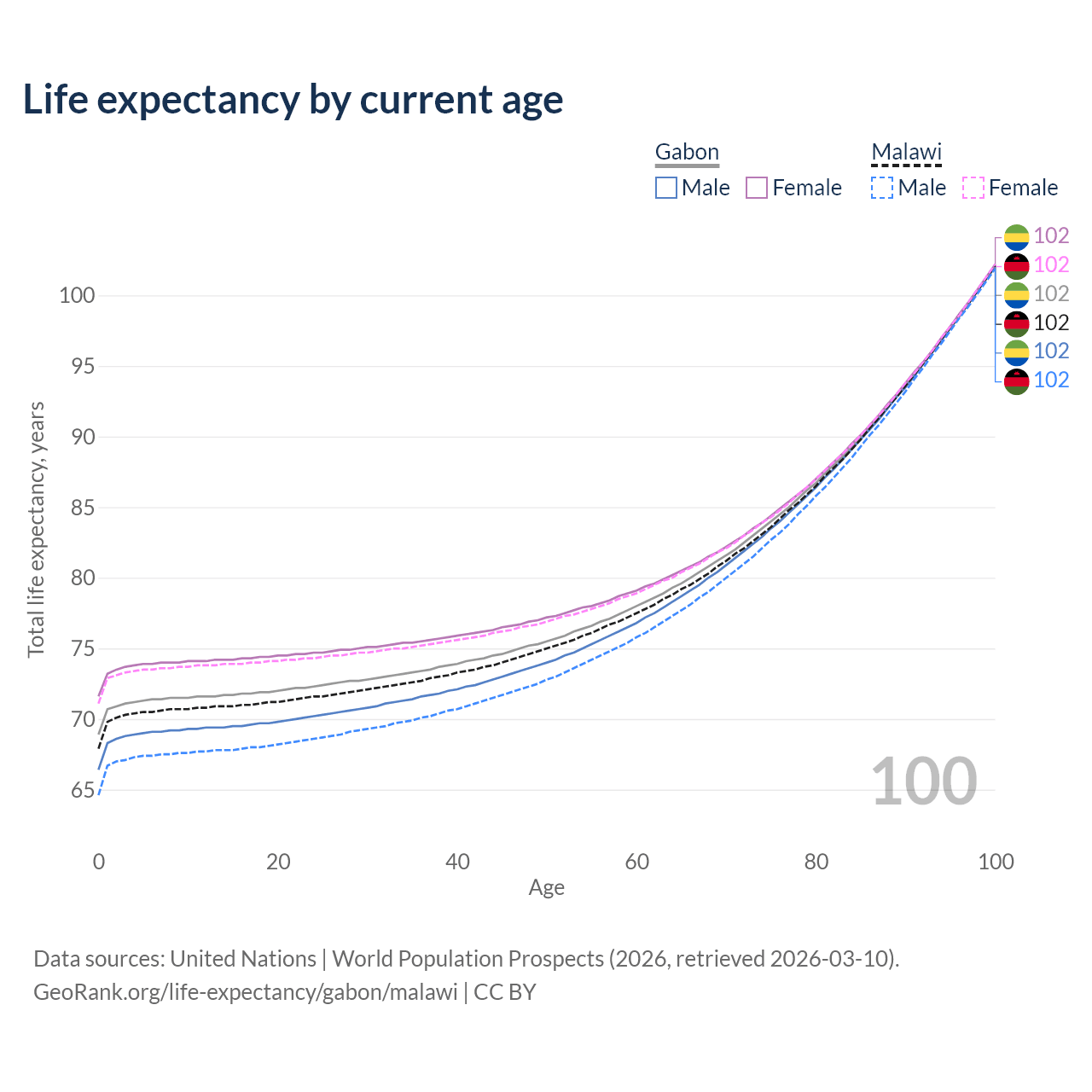 This life expectancy calculator shows the odds of living to 100, 95, 90, and below based on current age for both males and females in Gabon and Malawi, along with mean and median age of death. The calculations are based on the 2026 life tables (actuarial tables) from the UN World Population Prospects.