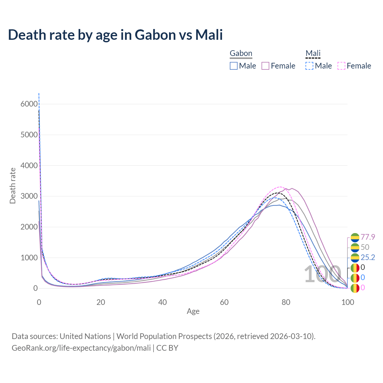 The average life expectancy at birth is 68.9 years in Gabon vs 61.1 in Mali. Gabon is ranked 147/197 by life expectancy, and Mali is 191/197. In Gabon, the life expectancy is 66.4 years for males and 71.6 years for females. In Mali, it's 59.7 years for males and 62.6 years for females.