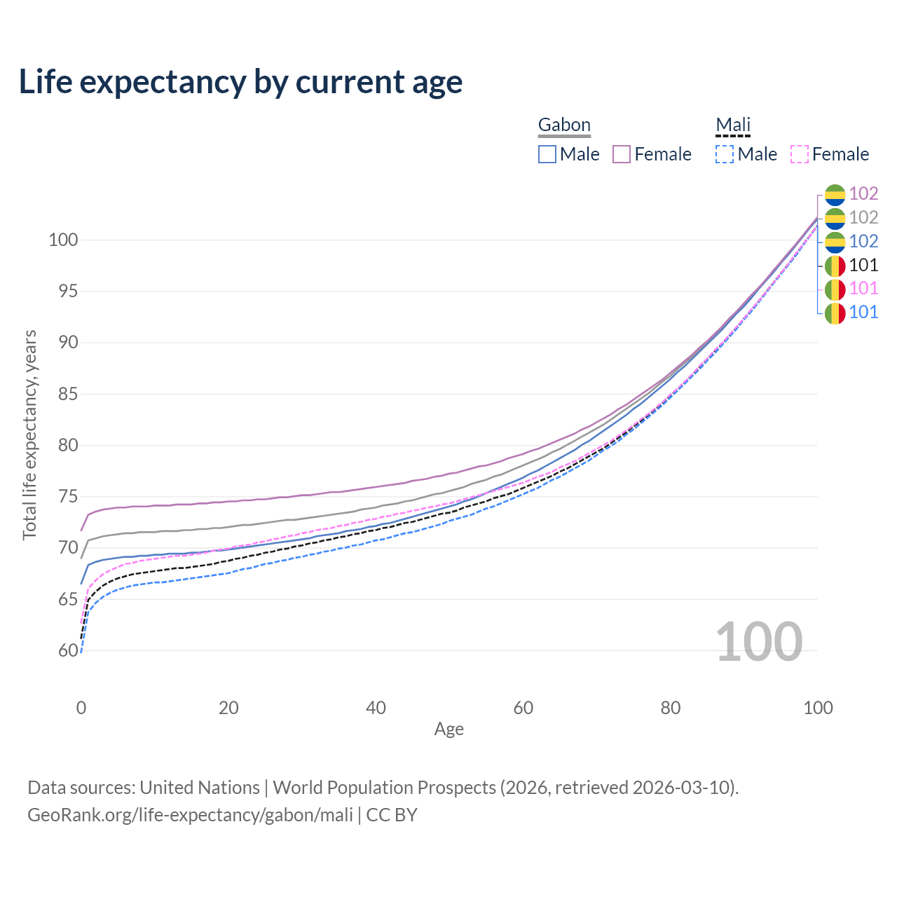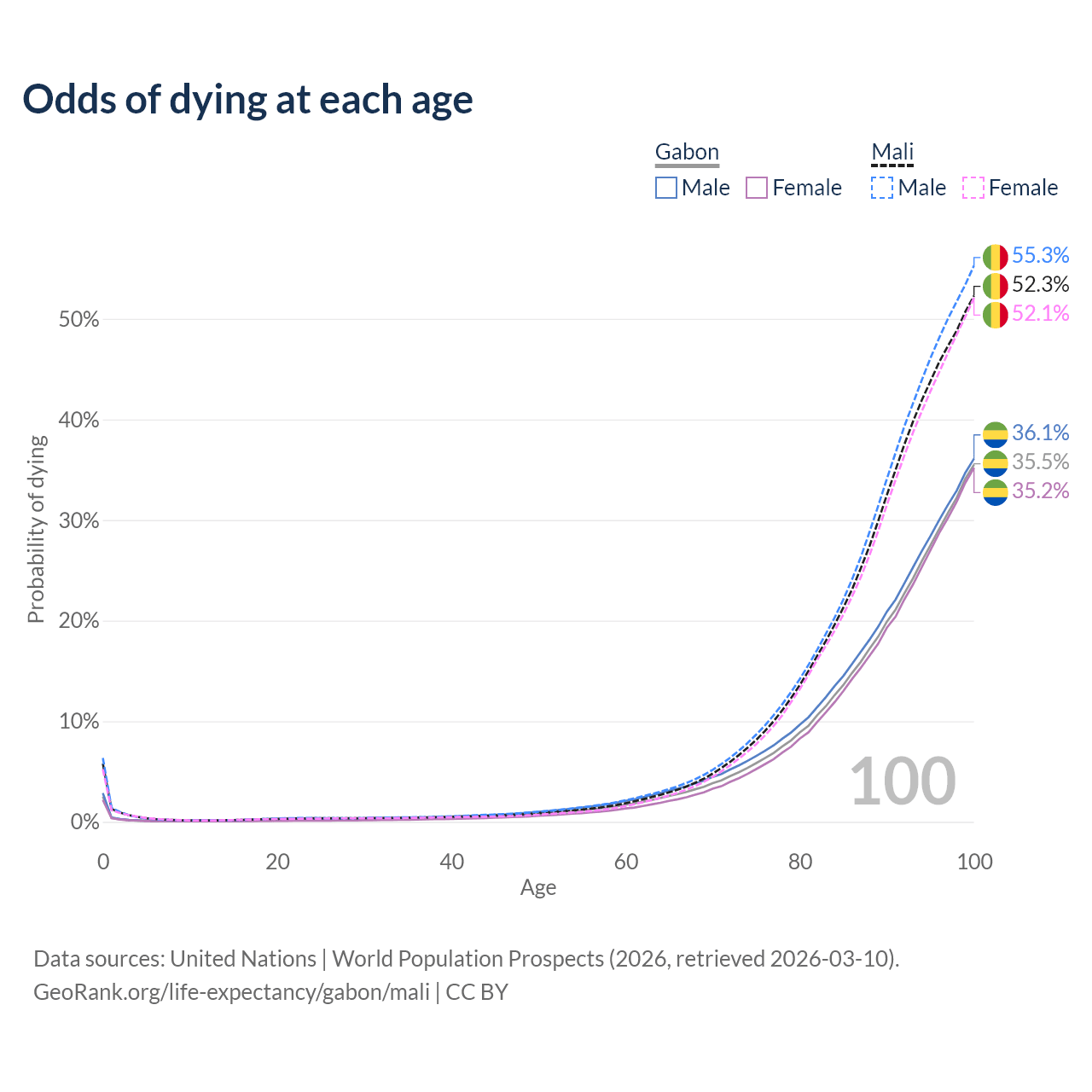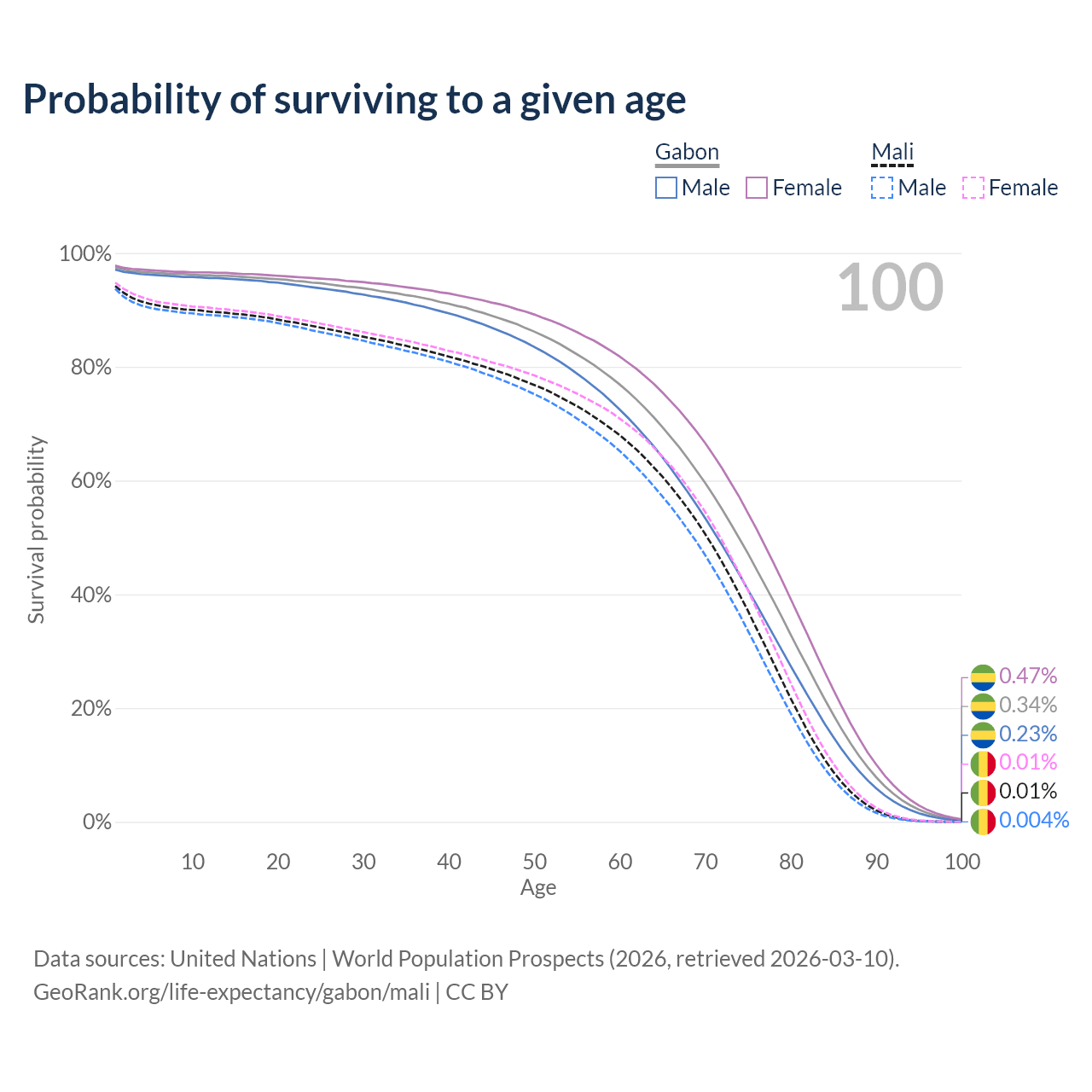 This life expectancy calculator shows the odds of living to 100, 95, 90, and below based on current age for both males and females in Gabon and Mali, along with mean and median age of death. The calculations are based on the 2026 life tables (actuarial tables) from the UN World Population Prospects.