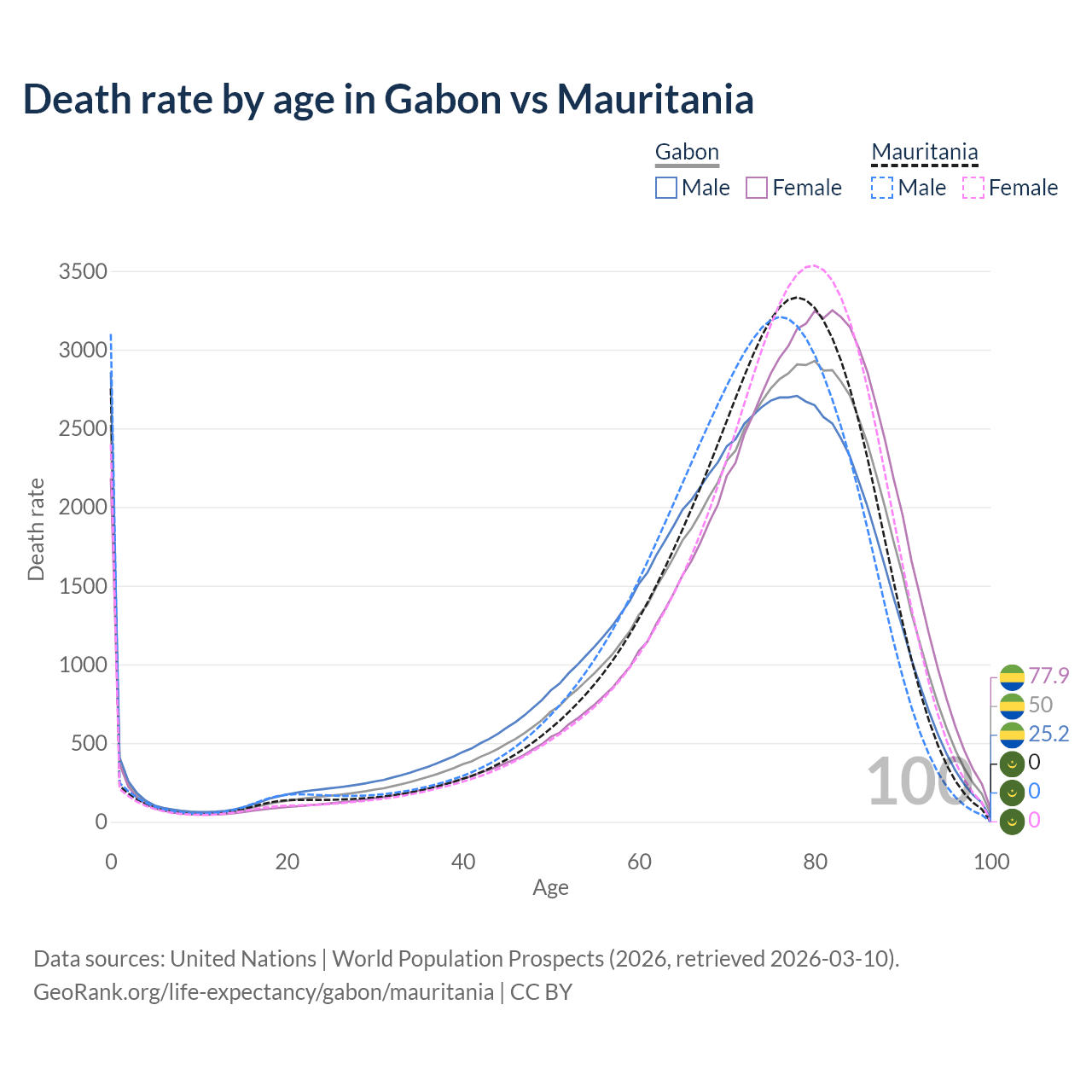 In Gabon, the most common age of death is 80, compared to 78 in Mauritania. The median age of death is 73.9 in Gabon and 74.1 in Mauritania, meaning only half of each cohort is expected to live past that age.