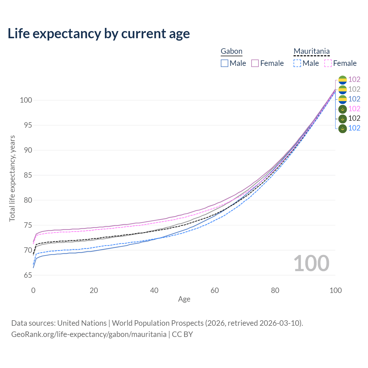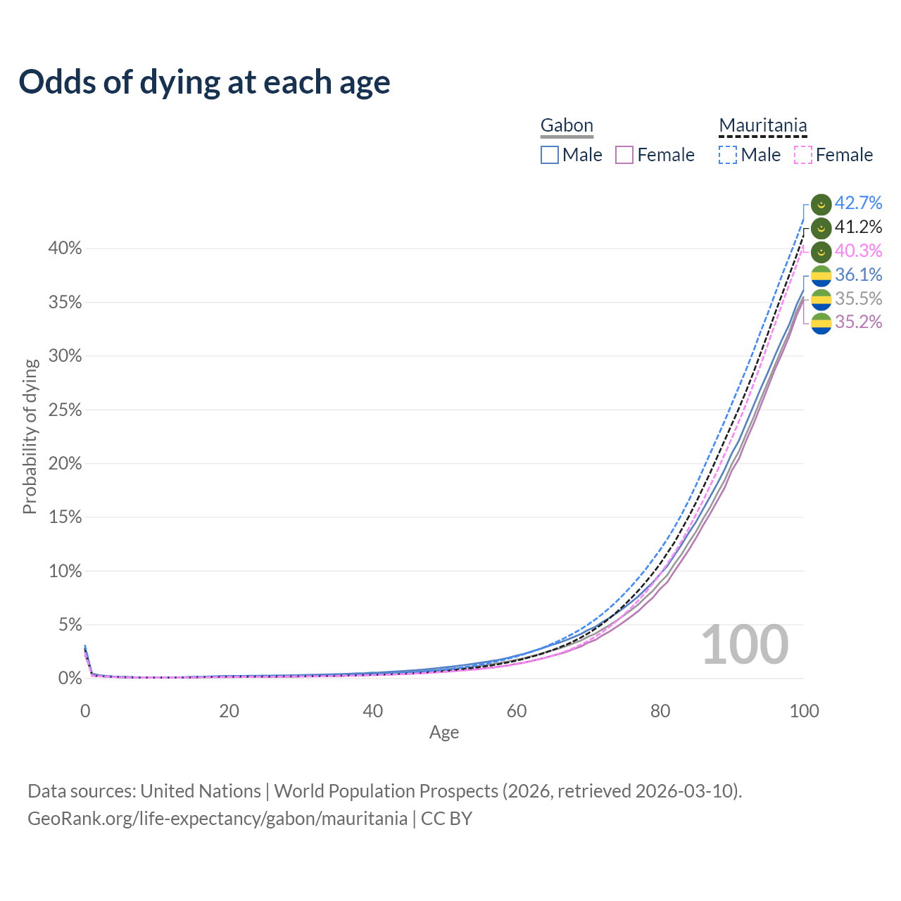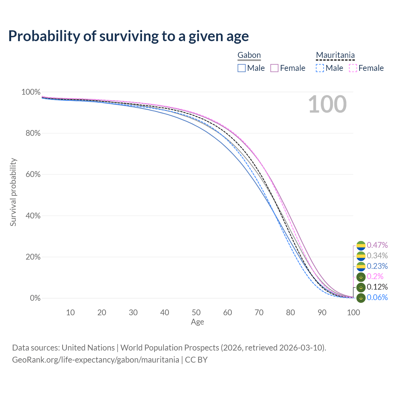 This life expectancy calculator shows the odds of living to 100, 95, 90, and below based on current age for both males and females in Gabon and Mauritania, along with mean and median age of death. The calculations are based on the 2026 life tables (actuarial tables) from the UN World Population Prospects.