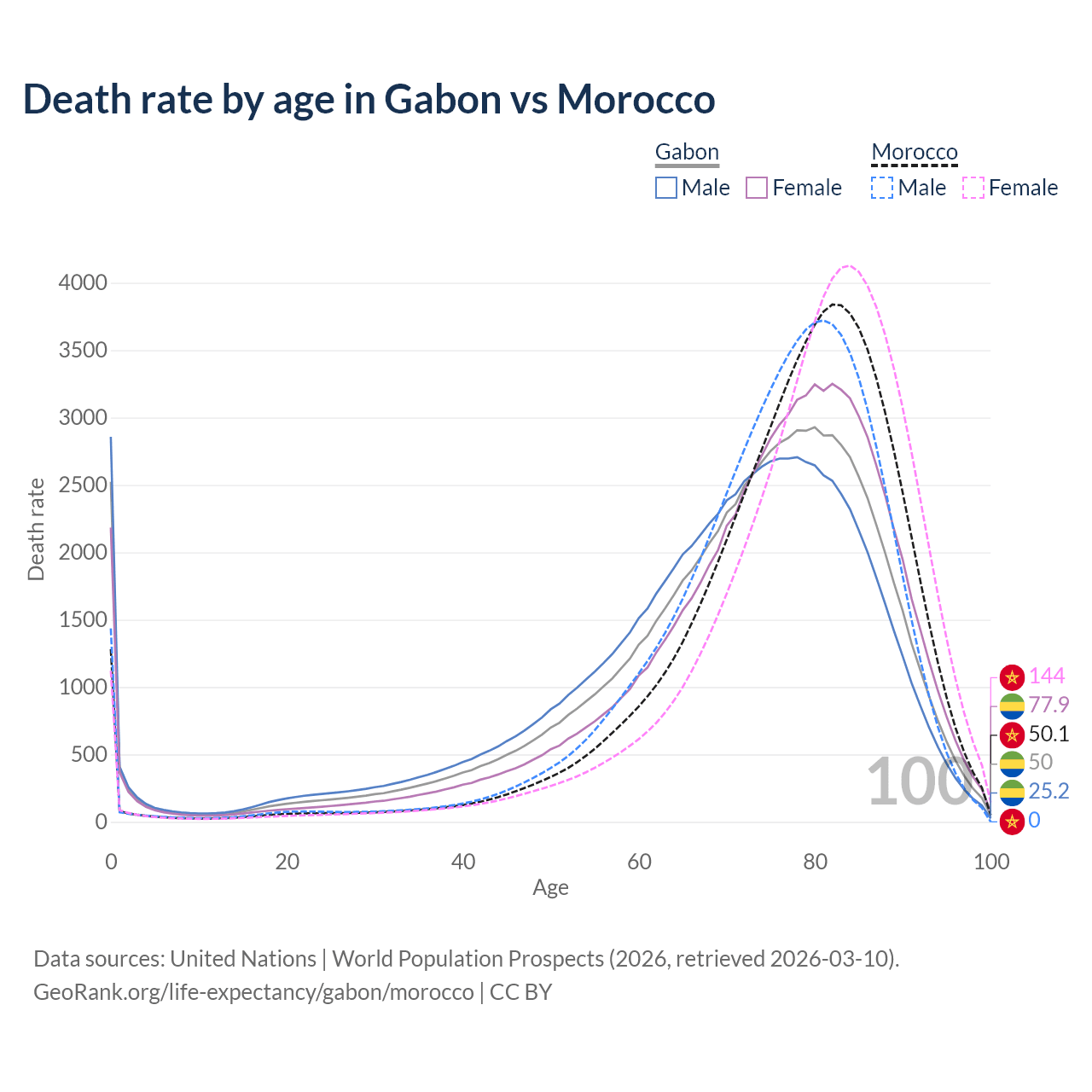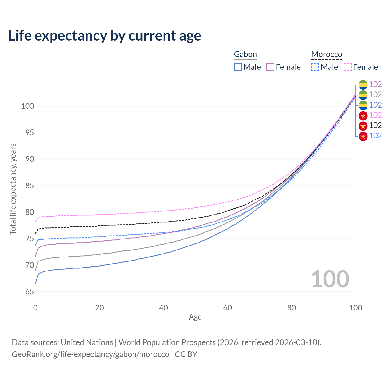 This life expectancy calculator shows the odds of living to 100, 95, 90, and below based on current age for both males and females in Gabon and Morocco, along with mean and median age of death. The calculations are based on the 2026 life tables (actuarial tables) from the UN World Population Prospects.