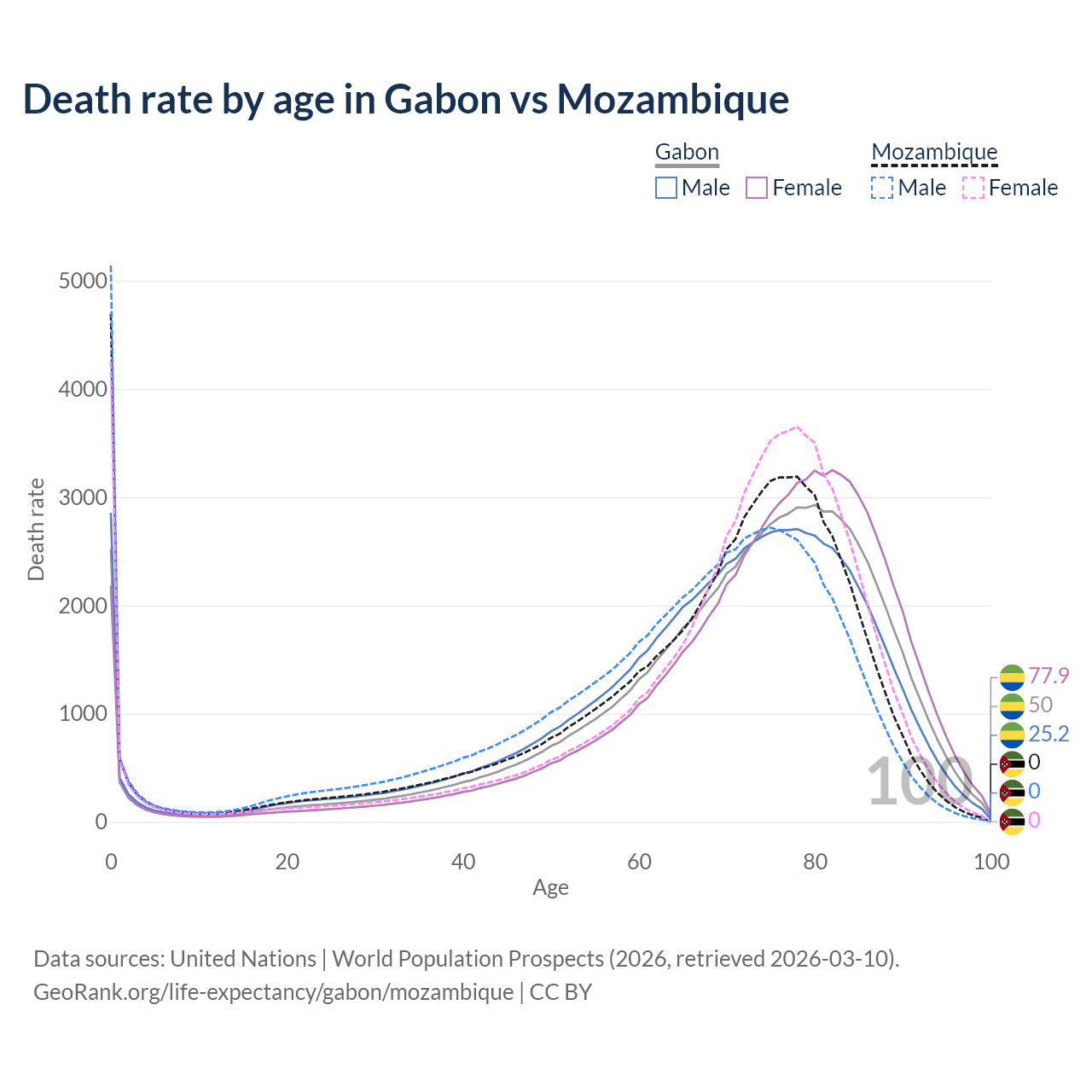In Gabon, the most common age of death is 80, compared to 0 in Mozambique. The median age of death is 73.9 in Gabon and 71.2 in Mozambique, meaning only half of each cohort is expected to live past that age.