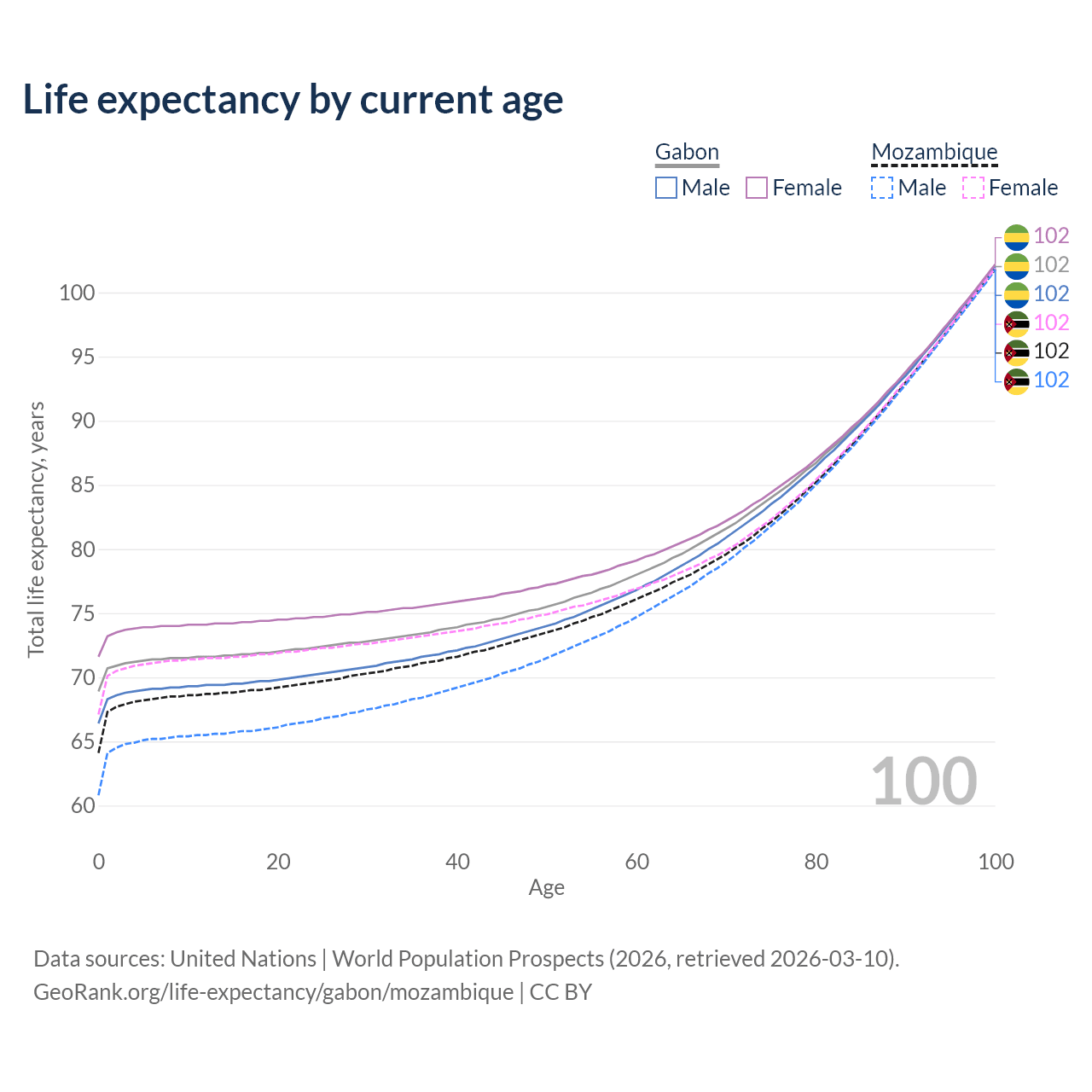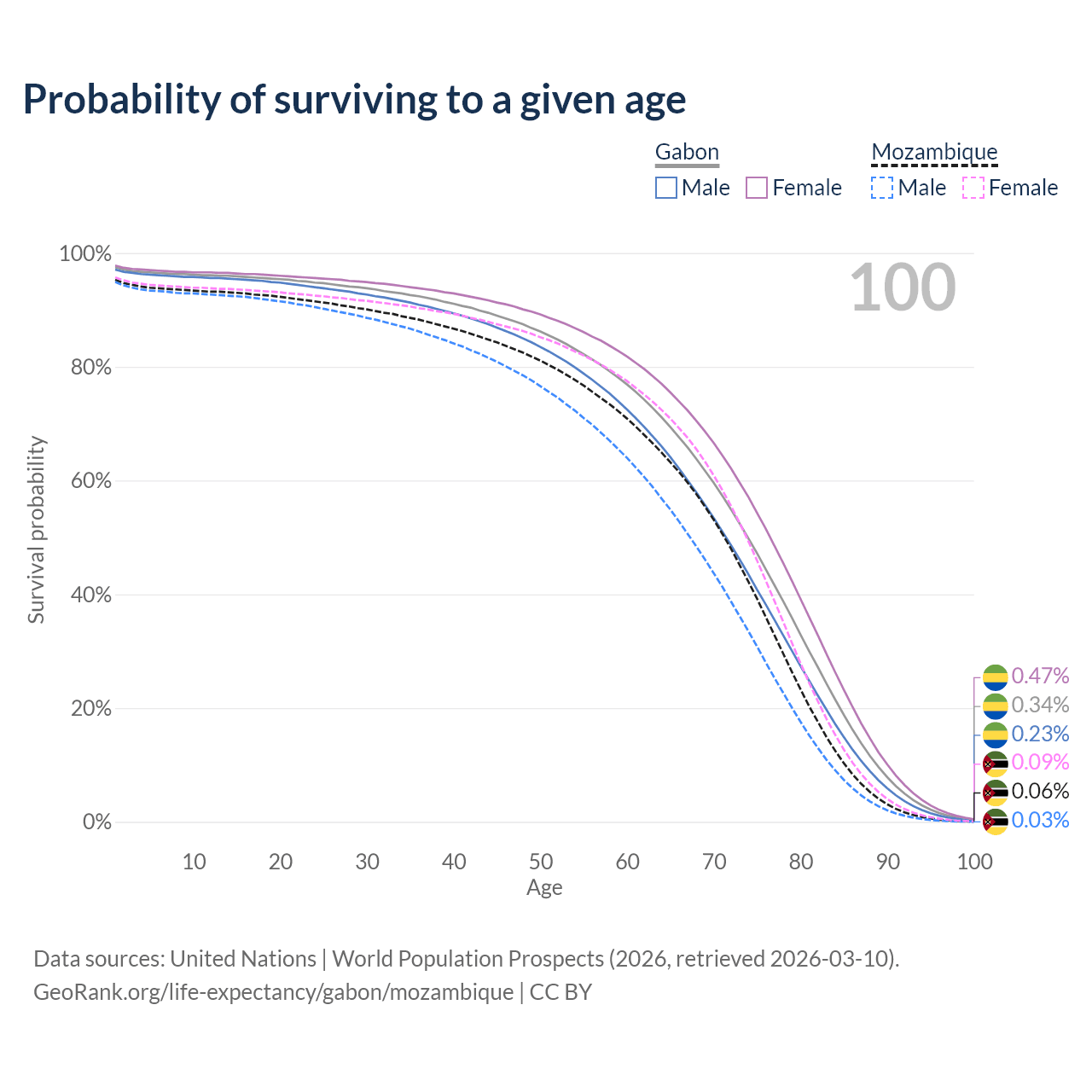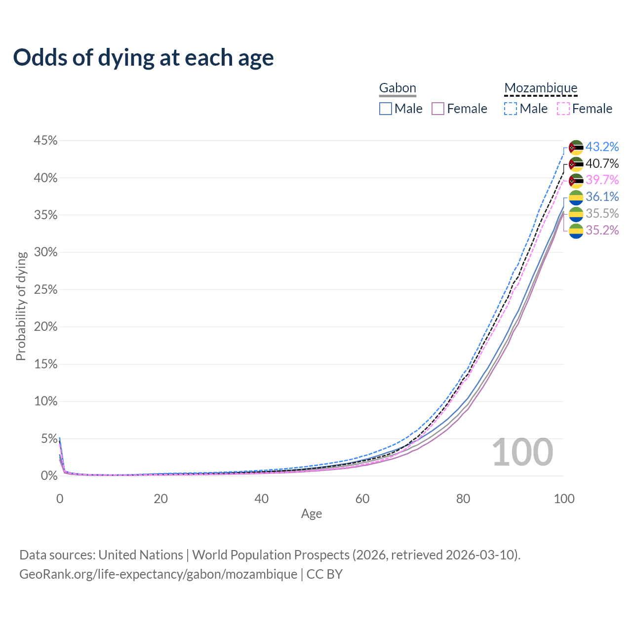 This life expectancy calculator shows the odds of living to 100, 95, 90, and below based on current age for both males and females in Gabon and Mozambique, along with mean and median age of death. The calculations are based on the 2026 life tables (actuarial tables) from the UN World Population Prospects.