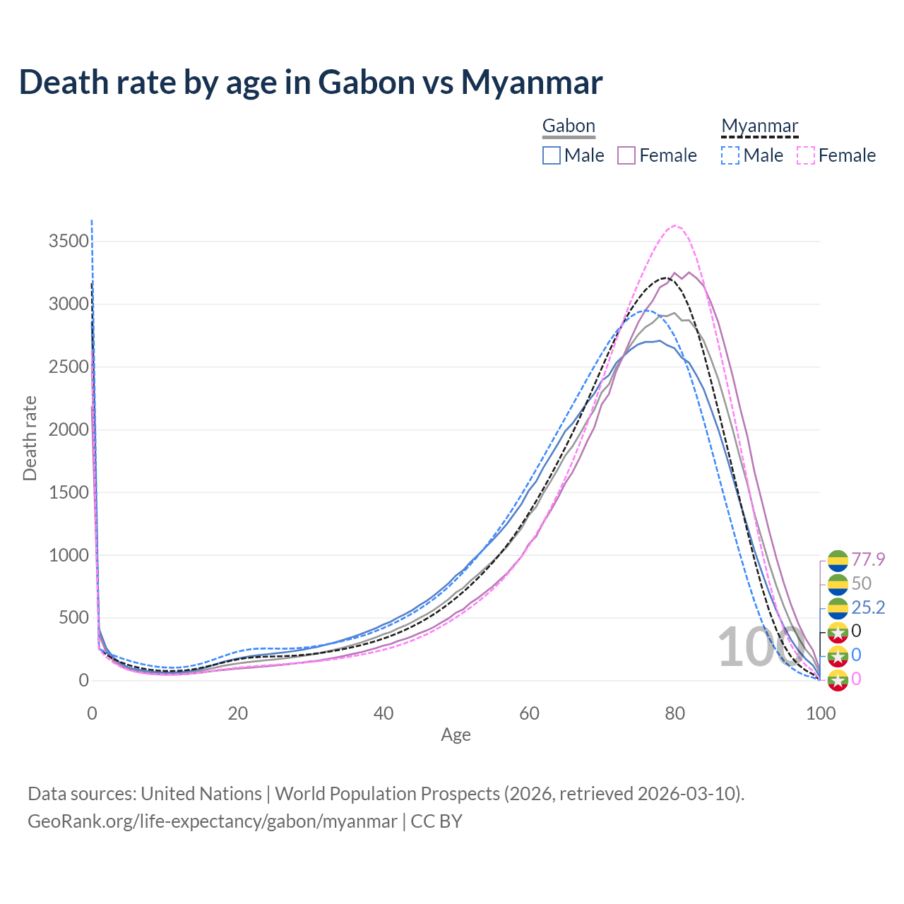 In Gabon, the most common age of death is 80, compared to 79 in Myanmar. The median age of death is 73.9 in Gabon and 73.1 in Myanmar, meaning only half of each cohort is expected to live past that age.