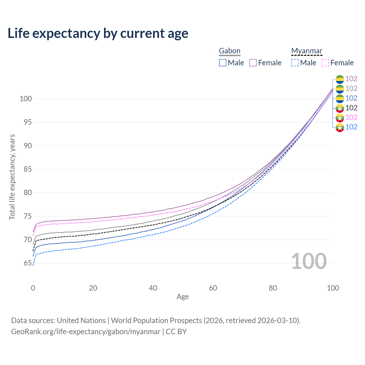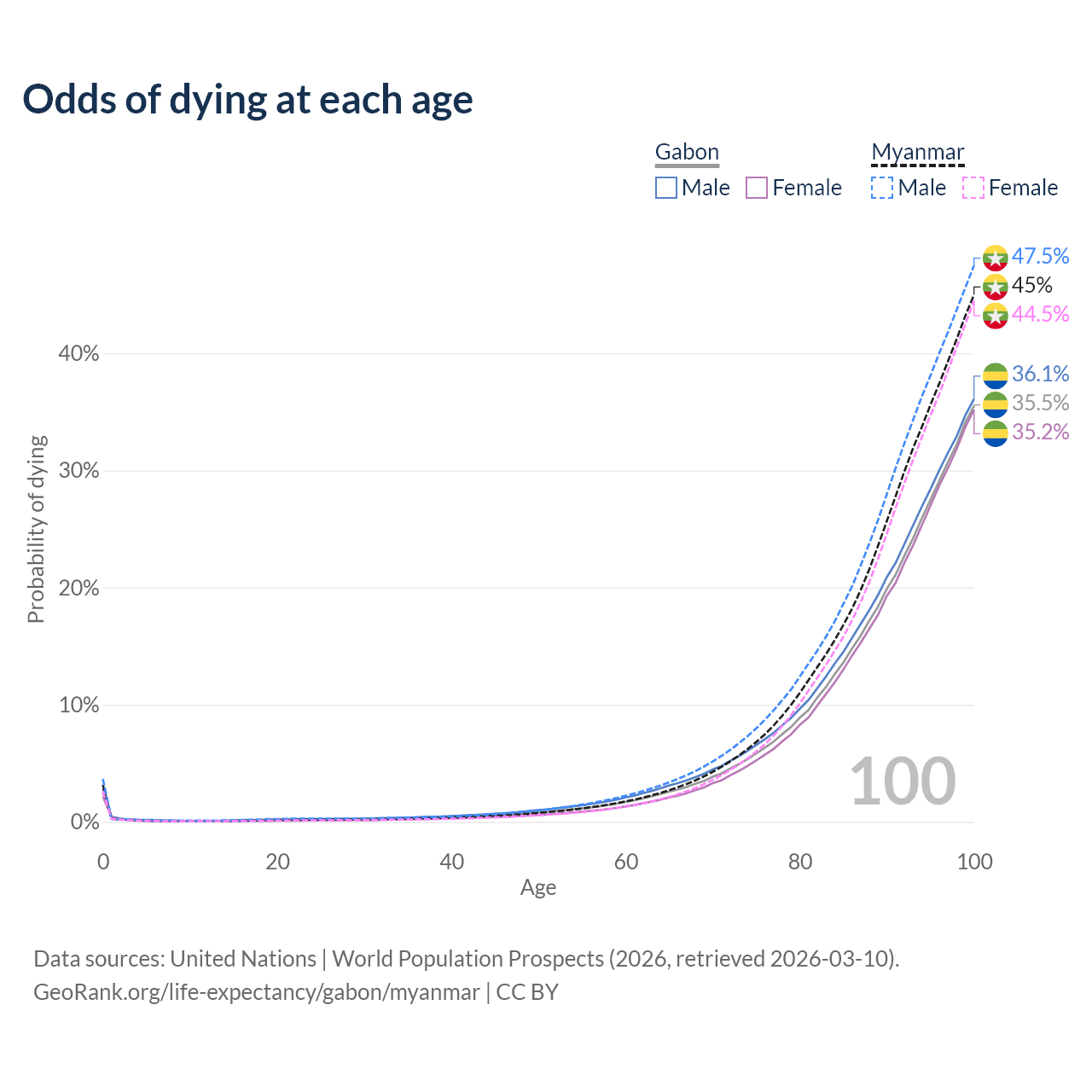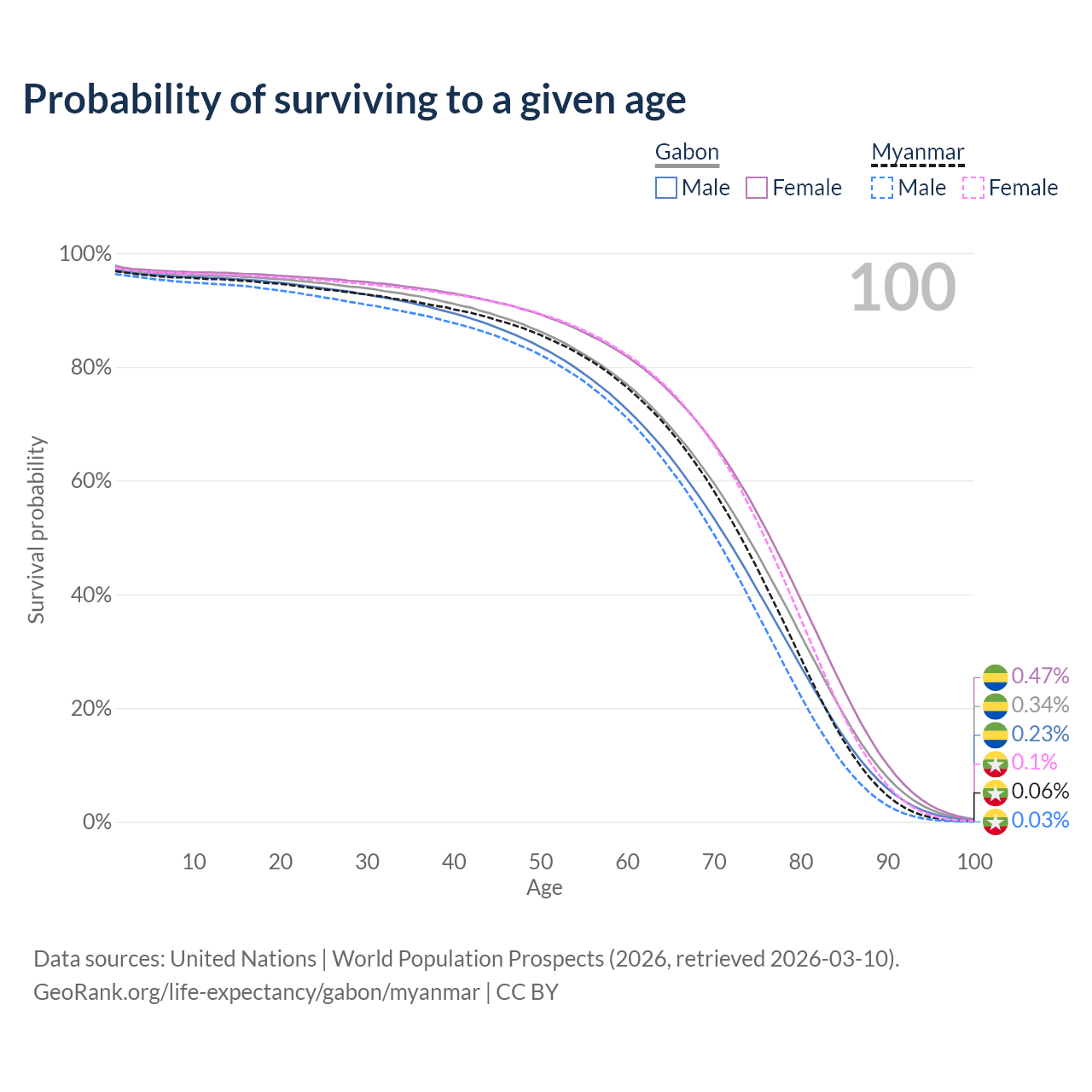 This life expectancy calculator shows the odds of living to 100, 95, 90, and below based on current age for both males and females in Gabon and Myanmar, along with mean and median age of death. The calculations are based on the 2026 life tables (actuarial tables) from the UN World Population Prospects.