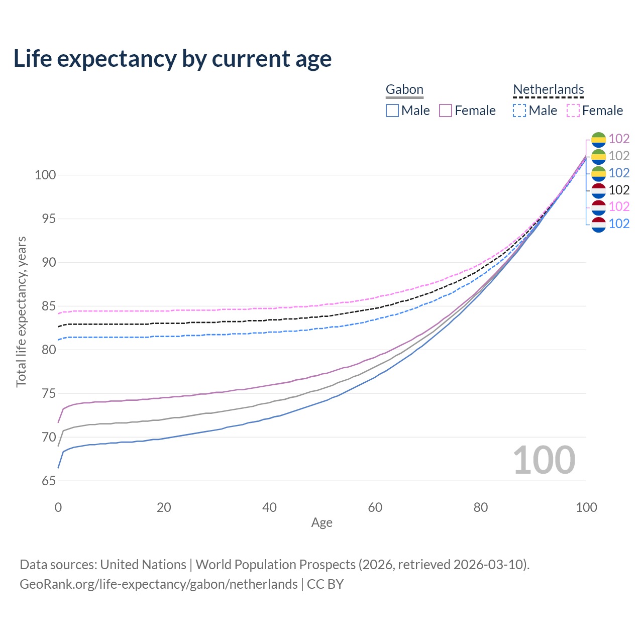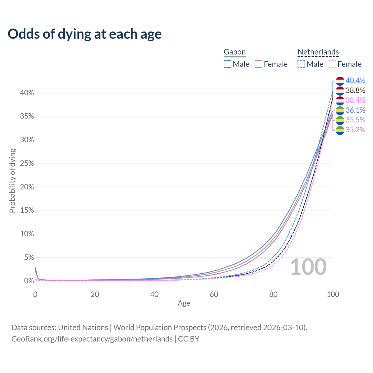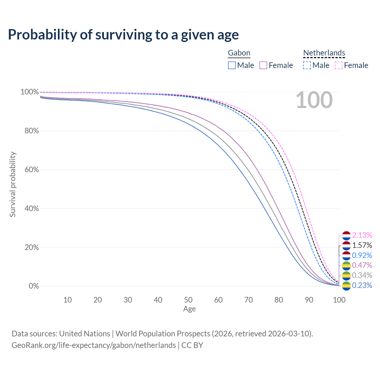 This life expectancy calculator shows the odds of living to 100, 95, 90, and below based on current age for both males and females in Gabon and the Netherlands, along with mean and median age of death. The calculations are based on the 2026 life tables (actuarial tables) from the UN World Population Prospects.