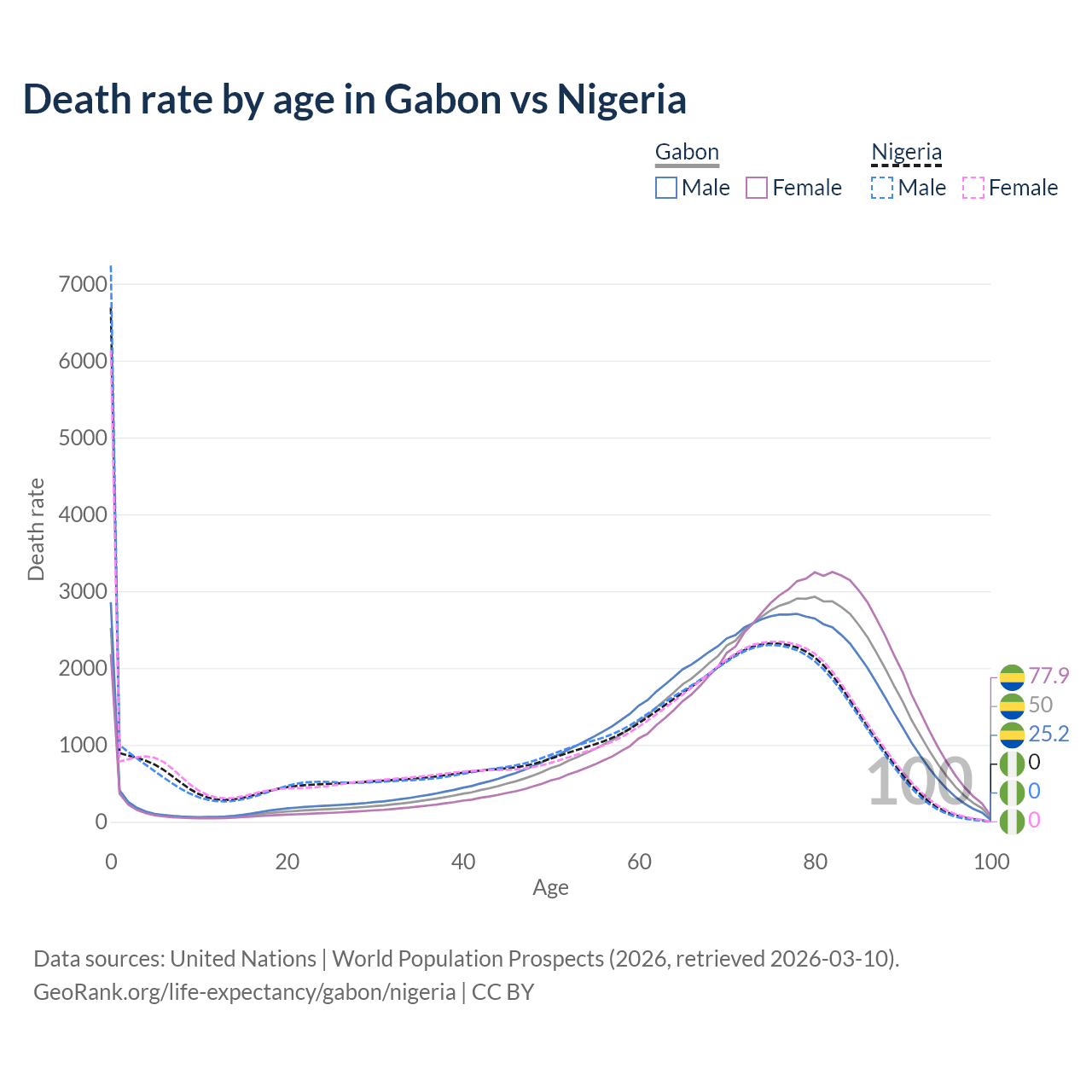 In Gabon, the most common age of death is 80, compared to 0 in Nigeria. The median age of death is 73.9 in Gabon and 64.3 in Nigeria, meaning only half of each cohort is expected to live past that age.