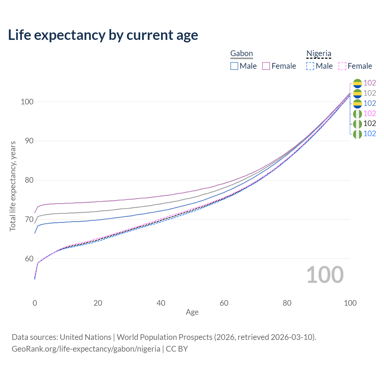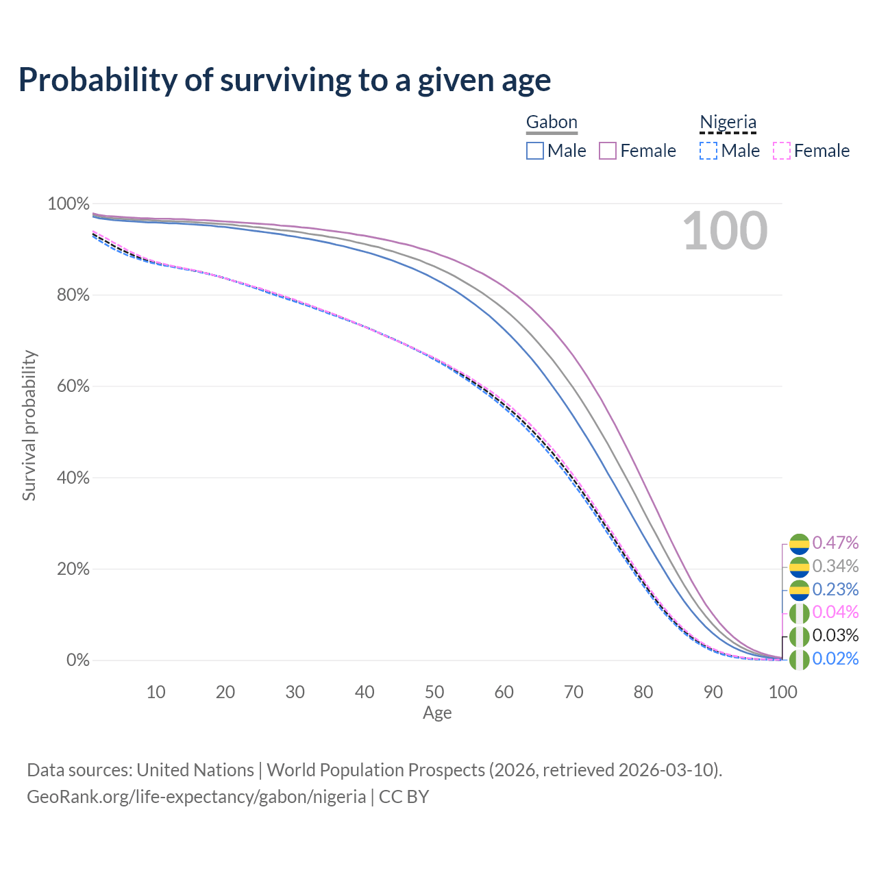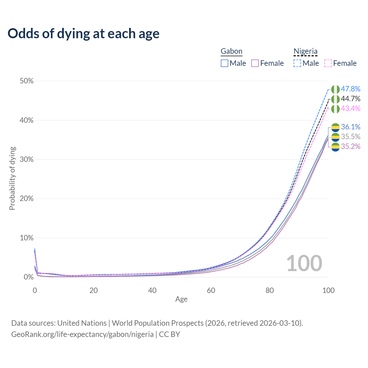 This life expectancy calculator shows the odds of living to 100, 95, 90, and below based on current age for both males and females in Gabon and Nigeria, along with mean and median age of death. The calculations are based on the 2026 life tables (actuarial tables) from the UN World Population Prospects.
